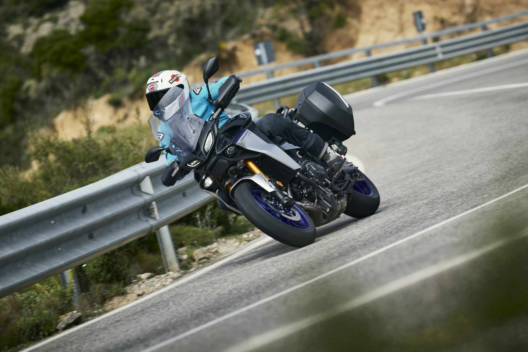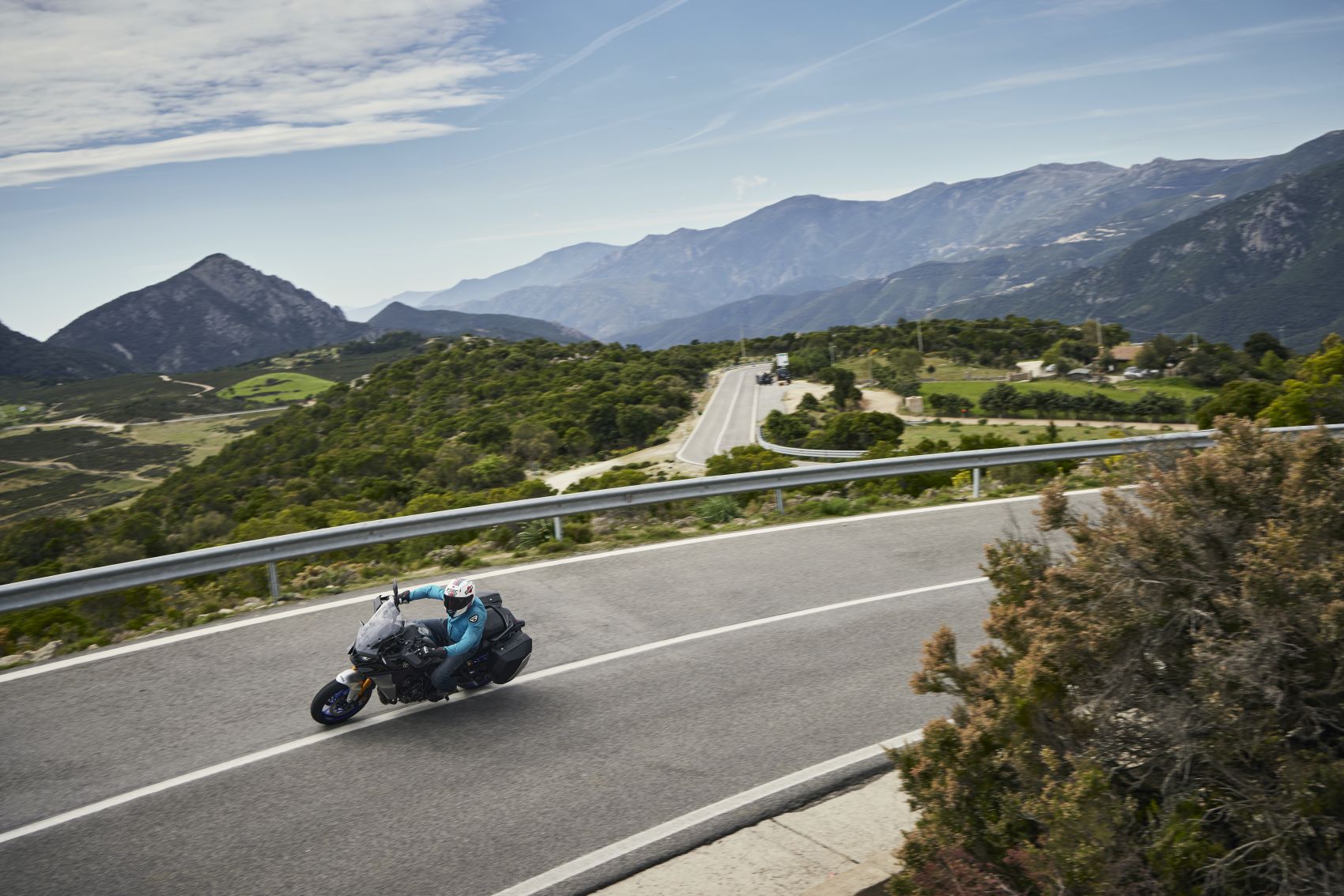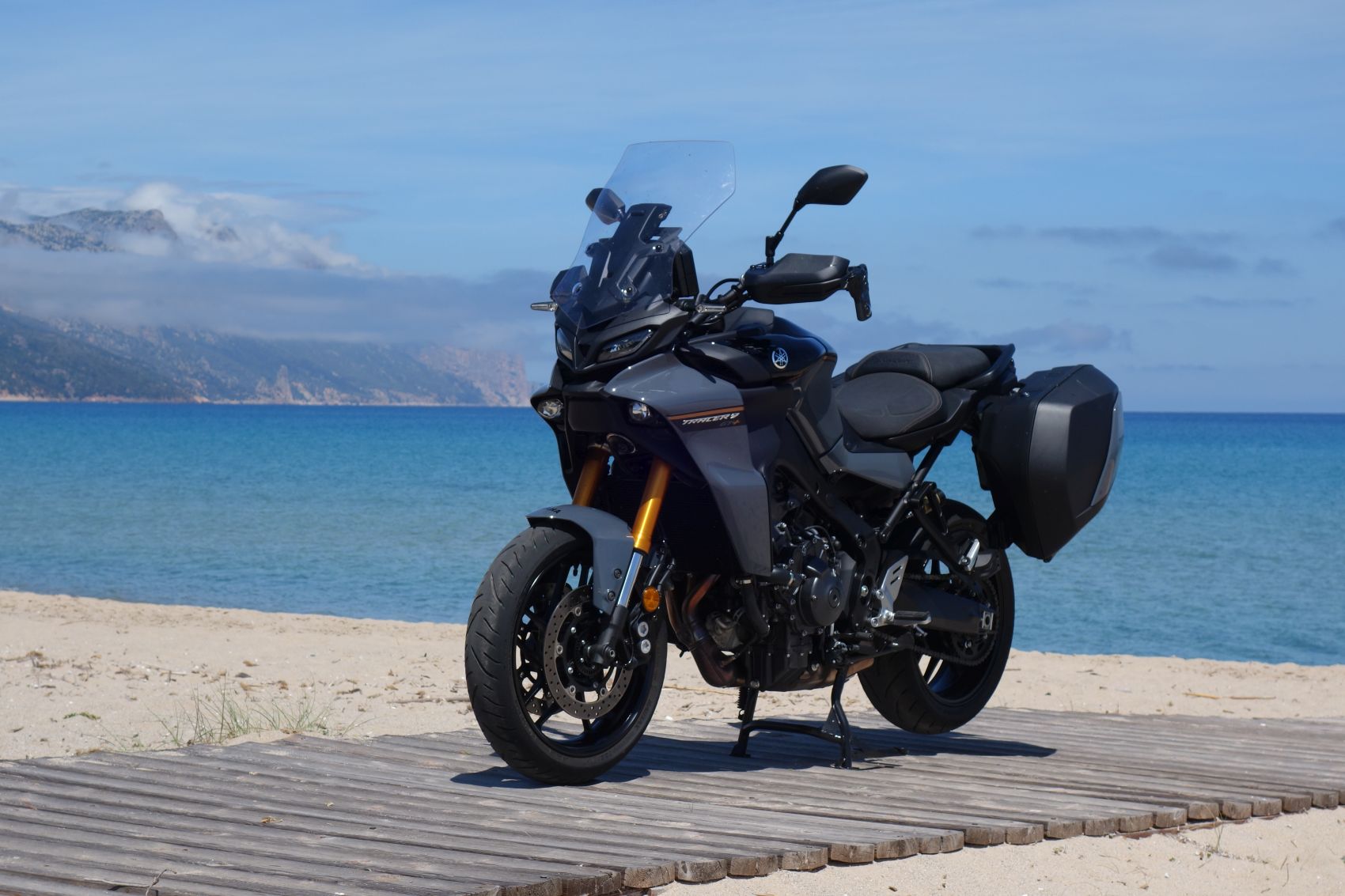 Nagy divat a fórumokban ócsárolni a vezetéssegédleteket, pláne, akinek nincsen pénze az elszálló árú új motorokra. Szerintem is megvan a hajdani analóg, bowdenes technika bája, de kipörgés-gátló vagy a blokkolásgátló nem csak életet ment. Az IMU vezérelt rendszerek egy csomó lehetőséget kínálnak az egyéb részegységek bekapcsolásával, mint az elektromosan állítható futómű vagy a radaros tempomat. A Yamaha Connected Roads-nak hívja ezt az egészen jól hangolt rendszert, melynek működéséből a felhasználó nagyrészt nem észlel semmit. Csak azt, hogy a GT+ az igencsak változatos szardíniai kanyardzsungelben már-már kényelmetlenül nagy tempóval is tud haladni. Angol felvezetőnk minden bizonnyal valamelyik helyi bajnokságban edződött, mert igencsak kapaszkodnunk kellett utána az egyébként sem lassú osztrák és görög kollégákkal. Ezt a szigetet egyszerűen motorozásra teremtették, és nem csak domborzat miatt. Az aszfalt versenypályás tapadása mellett a gyér forgalom és a csekély hatósági jelenlét miatt is a legjobb hely a kanyargásra. A 125-ös út Dorgali és Osulei közötti ötven kilométeres szakasza pedig talán az egésznek az esszenciája. A 119 lovas sorhármas továbbra is komoly intenzitással tol ki a szűk kanyarokból is, a hibátlan gyorsváltóval élmény minden kigyorsítás. Pláne, hogy hagytak némi hangot is neki. Combos 93 newtonméteres nyomatékát hétezren adja le, így némileg magasabb tartományban szeret üzemelni, mint kéthengeres konkurensek. Ami egyáltalán nem baj, hiszen ez jól érzi magát a leszabályzás közelében is.