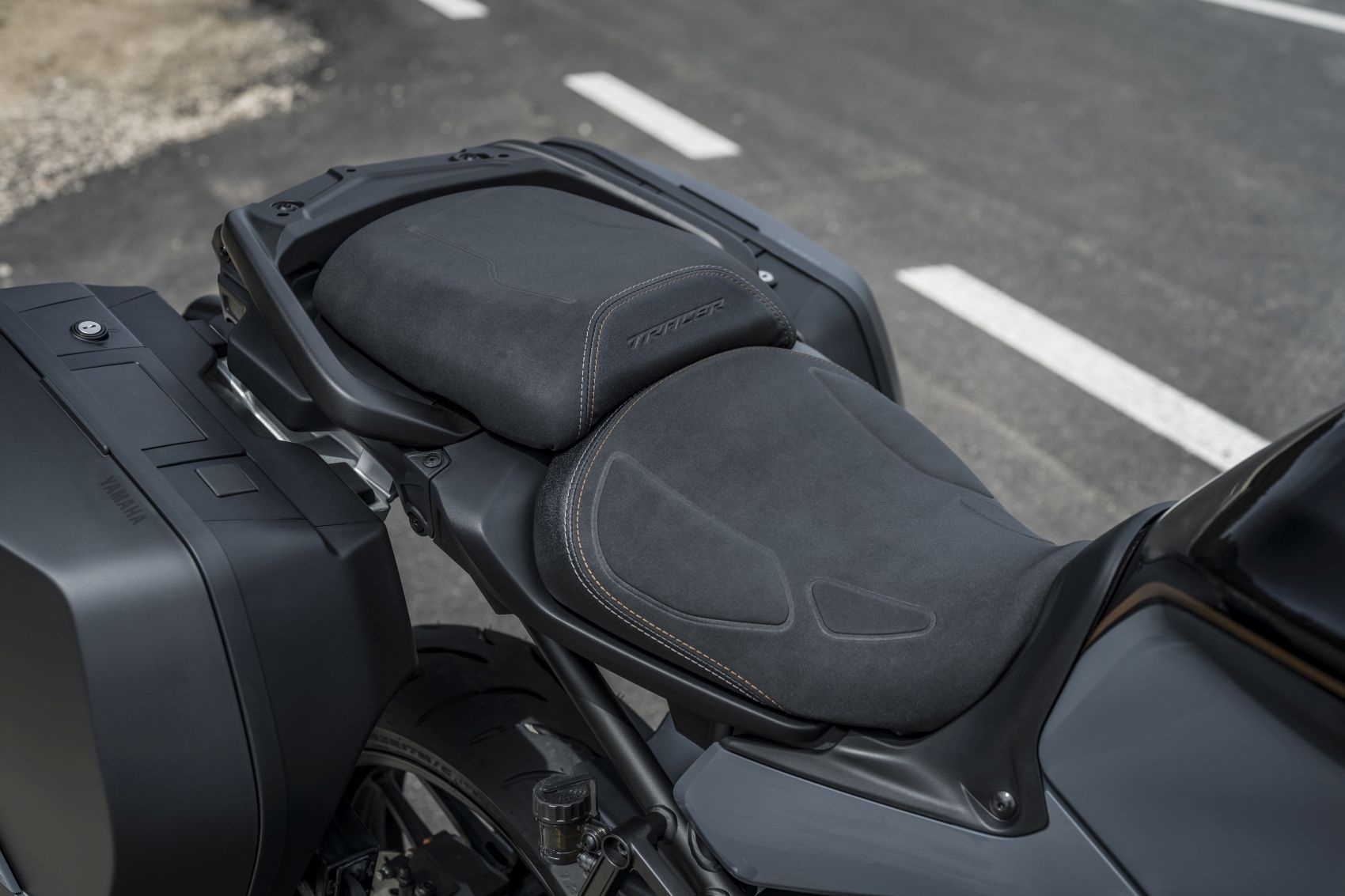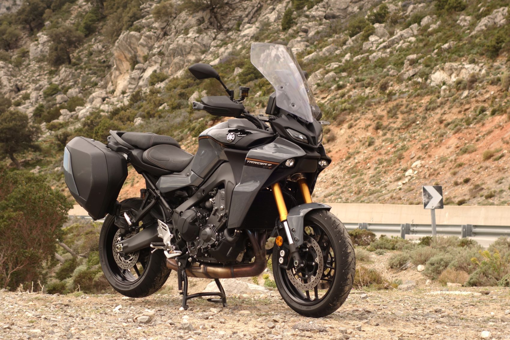 Az alapmodell mellett eddig a GT változat volt kapható, ami egyben tartalmazta a tempomatot, a markolatfűtést, gyorsváltót, az elektromos futóművet, a kanyarfényt és a két oldaldobozt is. Ezek zöme nélkül manapság már nem is érdemes szerintem komolyabb túramotort venni, még ha egyik-másik extrát nélkülözhetőnek is gondoljuk. A sorba harmadikként csatlakozik a GT+, amit a gyártó „Premium Sport Touring”-ként aposztrofál. Ez a kivitel megfejeli a csomagot egy távolságtartó radaros tempomattal, félaktív futóművel és új kormánykapcsolókkal, egy nagyobb tft kijelzővel és új színekkel. Nagy ügy! Gondolhatja az, akinek még nem volt alkalma kipróbálni ezeket a kütyüket, vagy szimplán csak irtózik a túlbonyolított vezetés-segédletektől. Így voltam én is a radaros tempomattal, de ne rohanjunk ennyire előre. A Tracer 9-esek egyik kevésbé sikerült pontja a menü átláthatatlansága és kisméretű dupla kijelző nehéz leolvashatósága, ezt még tetézi az utálatos nyomásérzetű és beragadásra hajlamos jobb oldali tekergőgomb, amivel az értelmezhetetlen menetmódokat lehetett esetleges jelleggel változtatni. A csúcsmodellen mindegyikkel leszámoltak! A T-Max-ról már ismerős 7 collos tft kijelzőn kiváló grafikával jelennek meg a végre nem számmal jelölt menetmódok. Melyeket értelemszerűen Rain, Road és Sport módra kereszteltek, és menü legmélyebb bugyraiban is egy kiválóan érezhető, határozottan mozgó négyállású joystickkal lehet navigálni. Természetesen van .gpx fájlok fogadásra alkalmas Garmin navi, ami nem csak nyilakat mutat, és Bluetooth kapcsolat rendelkezésre áll.