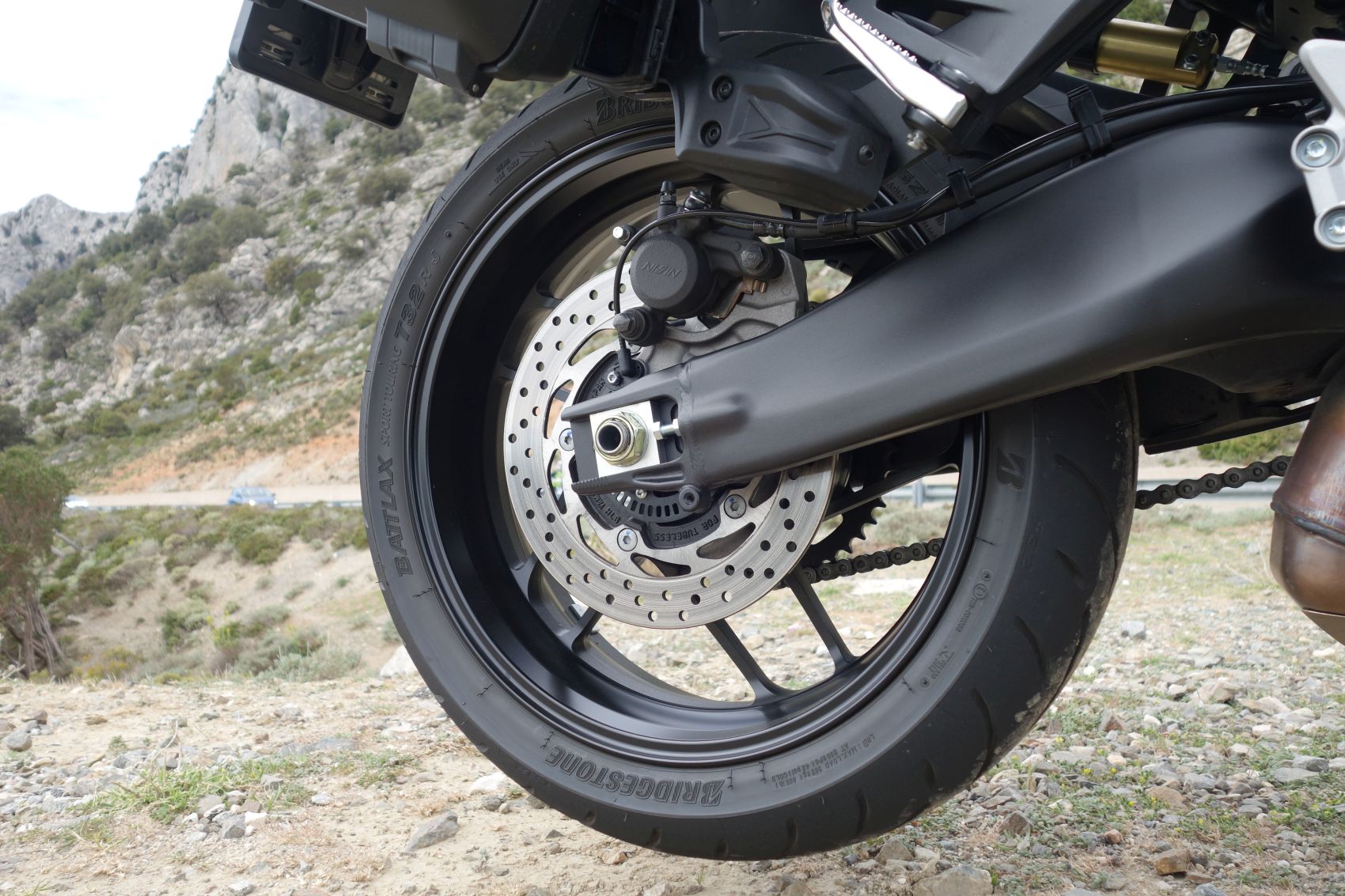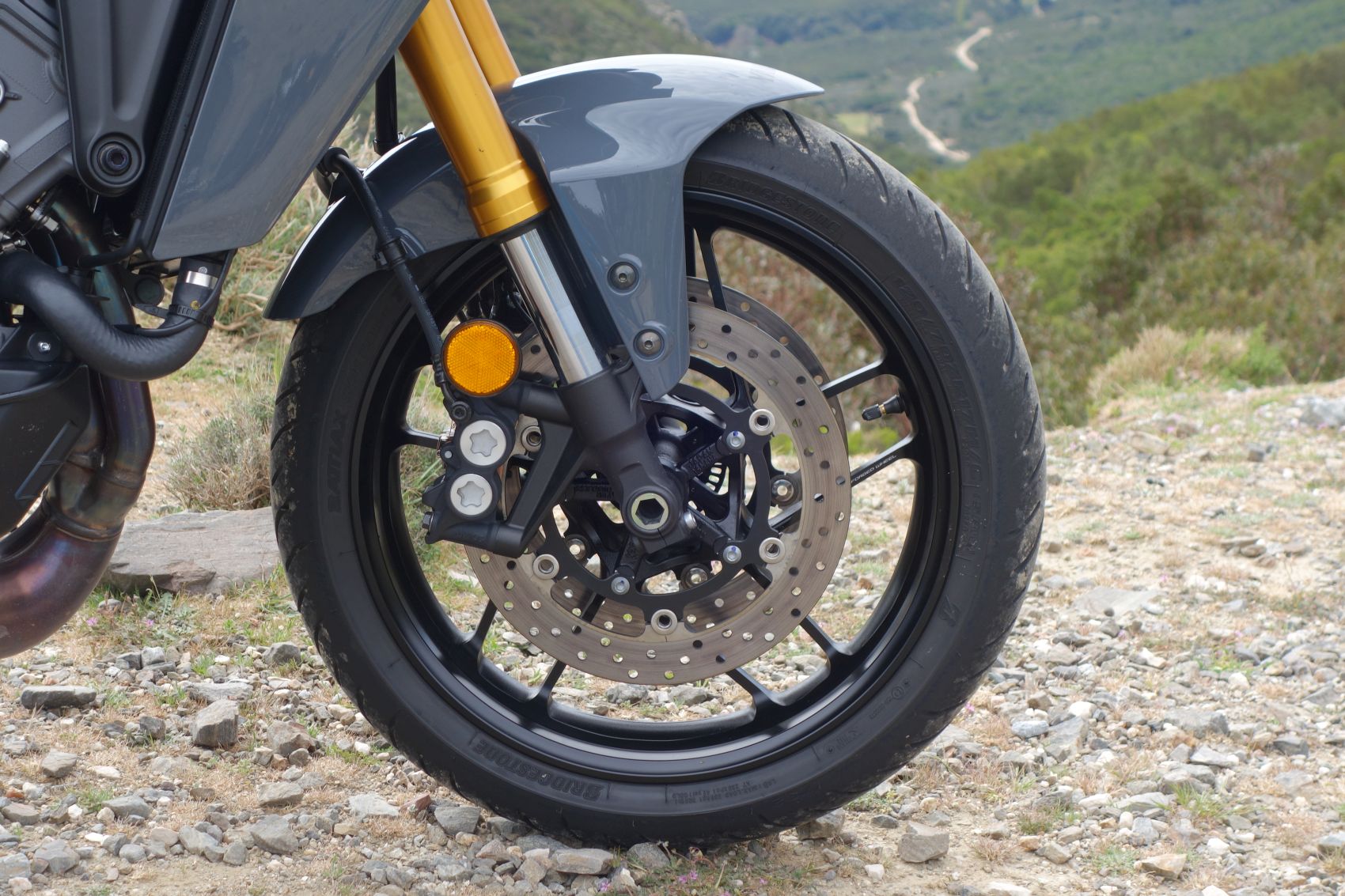 A radaros sebességtartó automatikától tényleg ódzkodtam, az értelmétől és a működésétől egyaránt. Továbbra is tudnék nélküle élni, de a rövid gyorsforgalmi szakaszon vagy városban csapatban motorozva kifejezetten hasznos tud lenni. Főként, ha a sor végére állsz be, mert kifejezetten pihentetővé teszi a csoportos haladást. Ha valaki hirtelen fékezne előtted, olyan villogásban tör ki a műszerfal, hogy garantáltan rámarsz a fékre. És ha nem mernél teljes a fékerőt húzni, az elektronika arra is rásegít. Fontos megjegyezni, hogy a fék-asszisztens nem fog helyetted vész-fékezni. Pláne, hogy a kifejezetten feltűnésmentesen beépített, és mindössze 200 gramm súlyú radar a hátsó féket használja a sebesség csökkentésére, ha már a gázvétel nem elég. Ezért GT+ megnövelt átmérőjű hátsó féktárcsát kapott. Akit mégis zavarna fékasszisztens, az menüből ki is kapcsolhatja. A követési távolság négy fokozatban állítható, 30 és 160 km/h közötti sebességtartományban működik. Ha vissza kellene váltani, akkor sem kell kikapcsolni: a gyorsváltó aktív tempomattal is működik. Végső soron energiát spórol neked a szimpla közlekedés közben, amit majd elhasználhatsz a kanyarvadászaton.