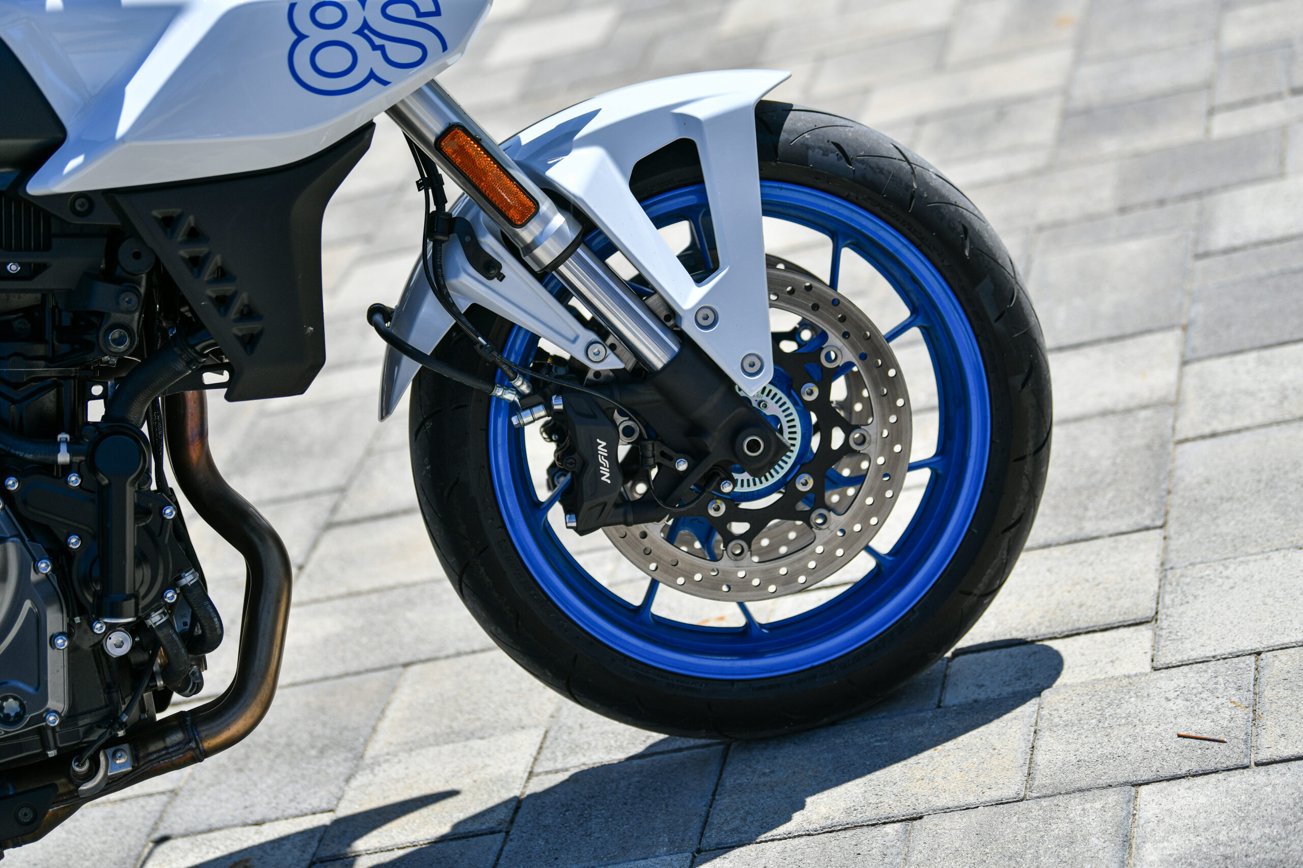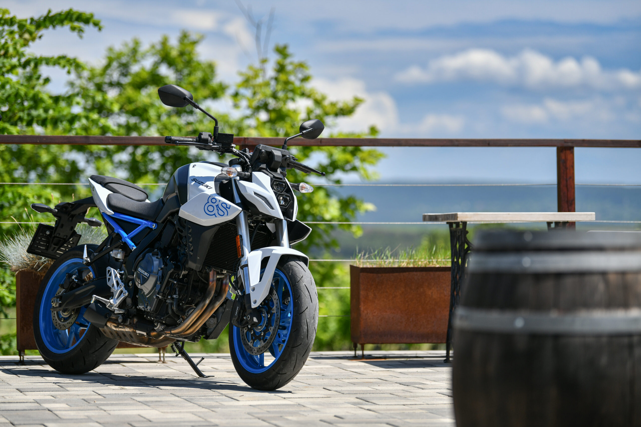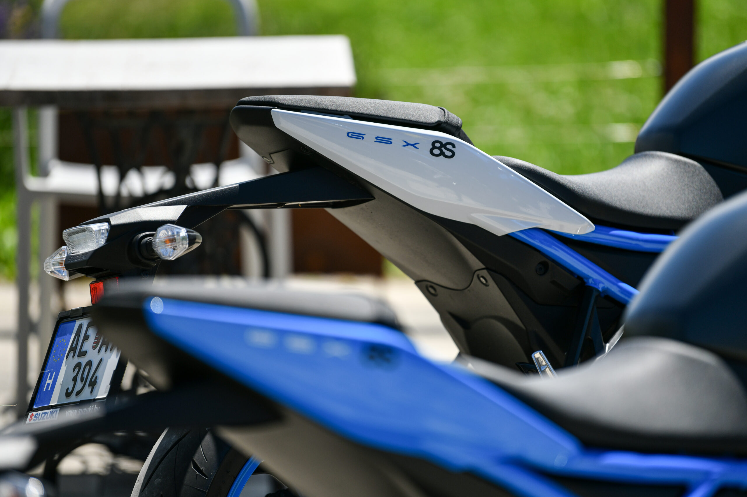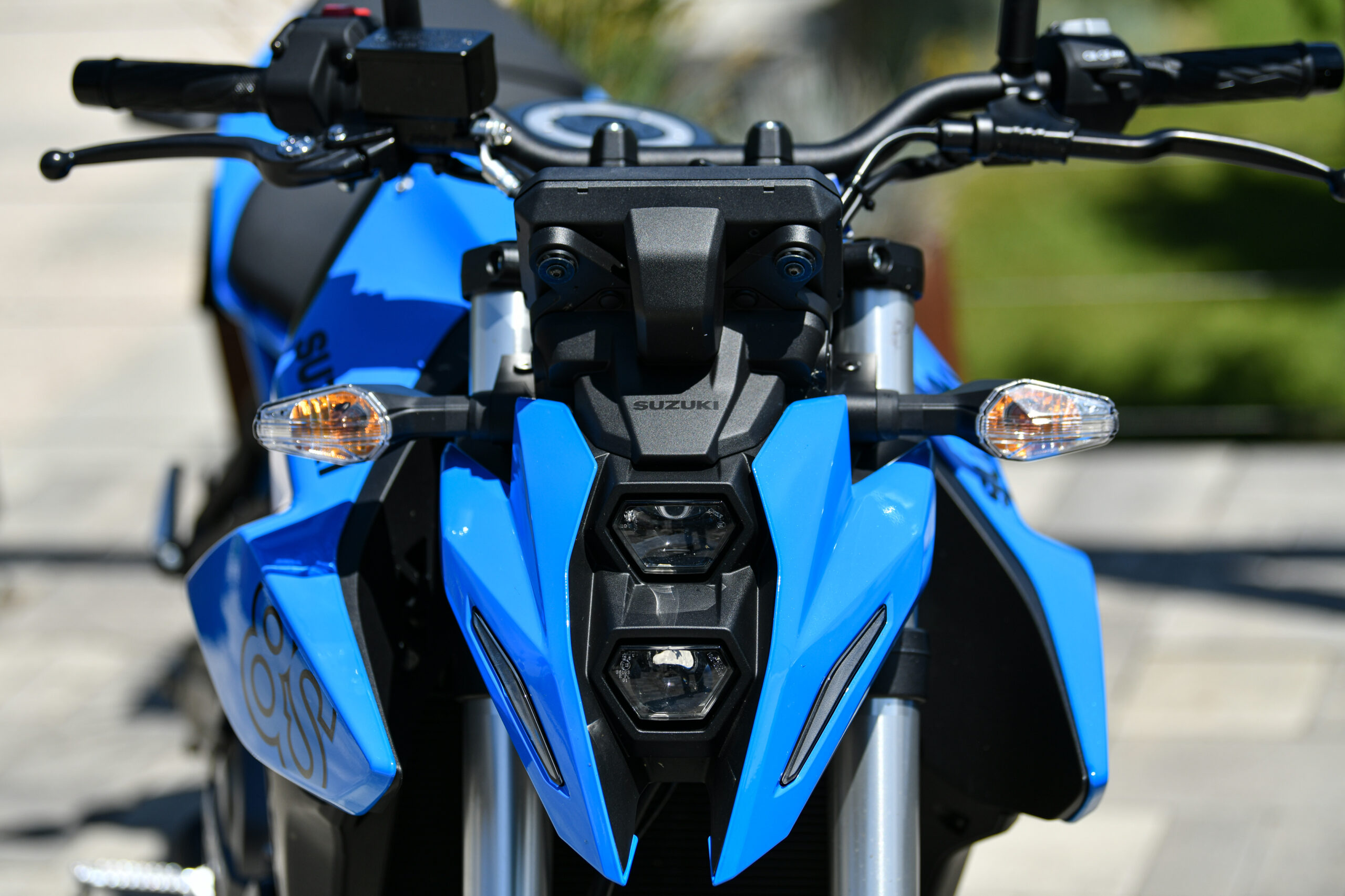 A GSX8 S formáját tekintve egy ízig vérig modern naked bike. Sok formai újdonságot persze ne várjunk egy idomokkal éppen csak megszórt motortól, pláne az árérzékeny középkategóriában. Ahol az évek óta egyeduralkodó Yamaha MT07-es éppen letaszítja a trónról a jóval erősebb és modernebb, mégis olcsóbb 750-es Honda Hornet. Vagy említhetném még a már kínai gyártású KTM Duke 790-et is, melynek sziluettje meglehetősen hasonlít a Suzukira. Viszont a hegyes fejidom az egymás fölé pozícionált fényszórókkal és a bajusz-szerűen elhelyezett menetfényekkel mégis egyedivé teszi, és térhálóra hajazó segédváz is igencsak tetszetős. A hátsó lámpát száműzték a rendszámtartóra, de farokidom végén lévő kupak azt az érzetet kelti bennem, hogy utólag gondolták meg magukat a tervezők. Illetve arra is nagyon kíváncsi lennék, miért akasztanak egy motorra még 2023-ban villanykörtés indexeket. További magánvélemény, hogy a teli kék és a fehér verzió is telitalálat. Kifejezetten kedvelem ezt a kék árnyalatot, de természetesen a biztonsági játékosoknak van egy teli fekete fényezés is. A hardware szemre is egészen ígéretes: radiális féknyergek és fordított teleszkóp elöl, masszívnak tűnő acél lengővilla 180-as hátsó gumival hátul. A rugózó elemek csillapítása sajnos nem állítható, csupán a hátsó rugó-előfeszítés.