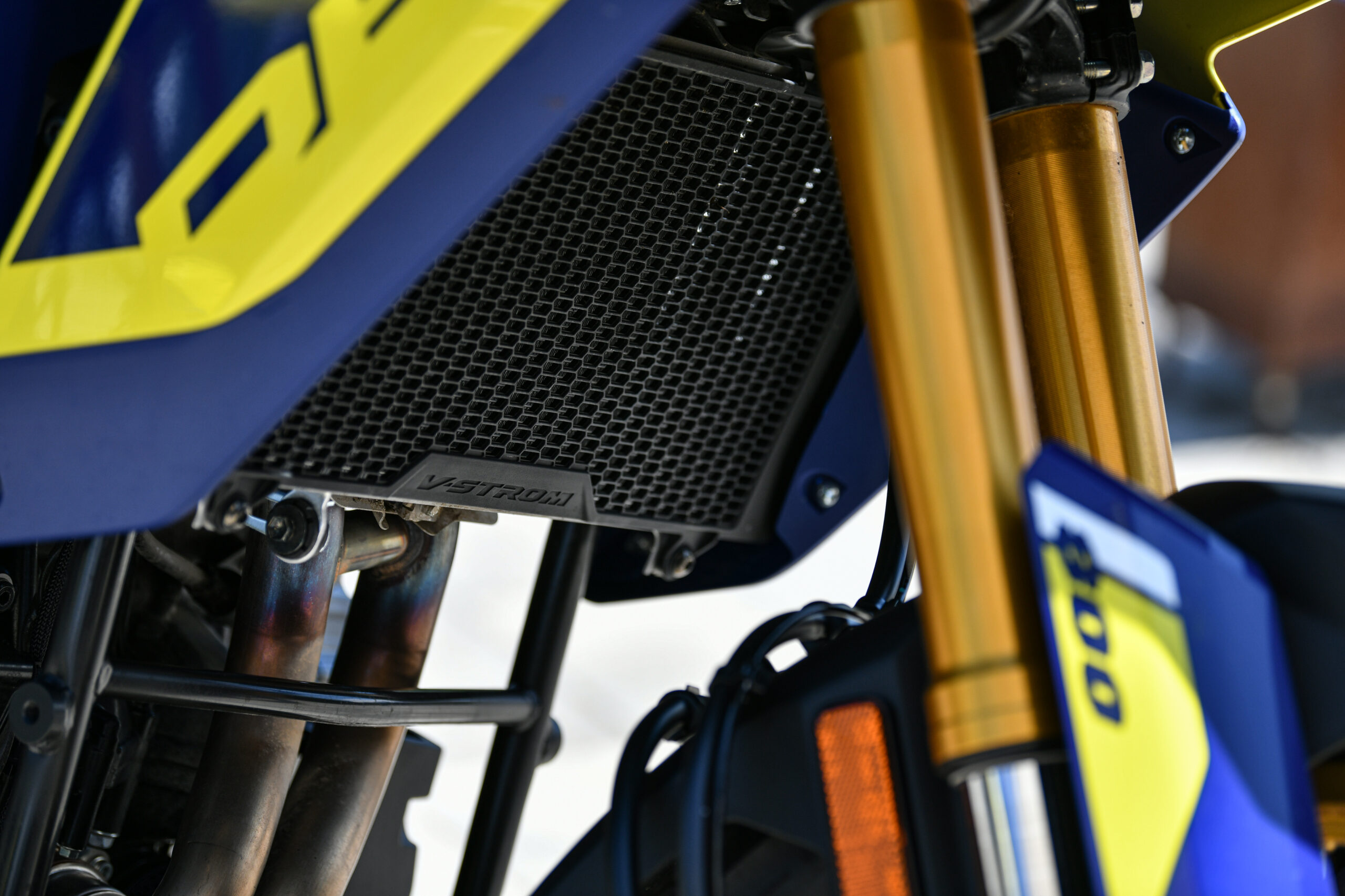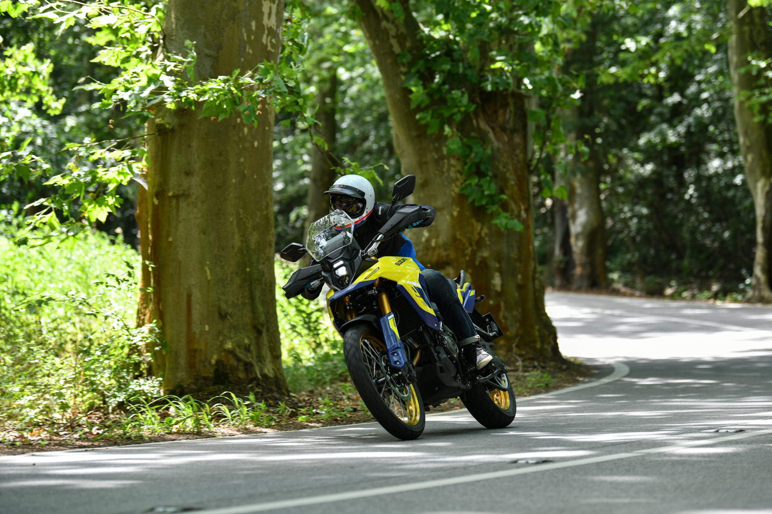 A főváz teljes mértékben megegyezik a GSX8-al, nagyobb teherbírású segédváz hál’Istennek csavarozott. Ez a műszaki igényesség nem mondható el például a Transalp-ról. Mondhatjuk, hogy a sorkettes miatt a V betű már értelmét vesztette, de a szintén sorkettes V-Strom 250 után már kár ezen rugózni. A 800-as blokk a magas kasztniban is jól teljesít, sőt itt van igazán elemében. A hosszabb kipufogó rendszer és nagyobb dob miatt eleve sokkal teltebb a hangja, a magas felépítés miatt még egykerekezni is sokkal könnyebb vele. Pedig a 20 kilós súlyhátránya még nagyobb a konkurensekhez képest, mint a GSX8 esetében. Terepen pedig minden egyes kiló kettővel többnek érződik.