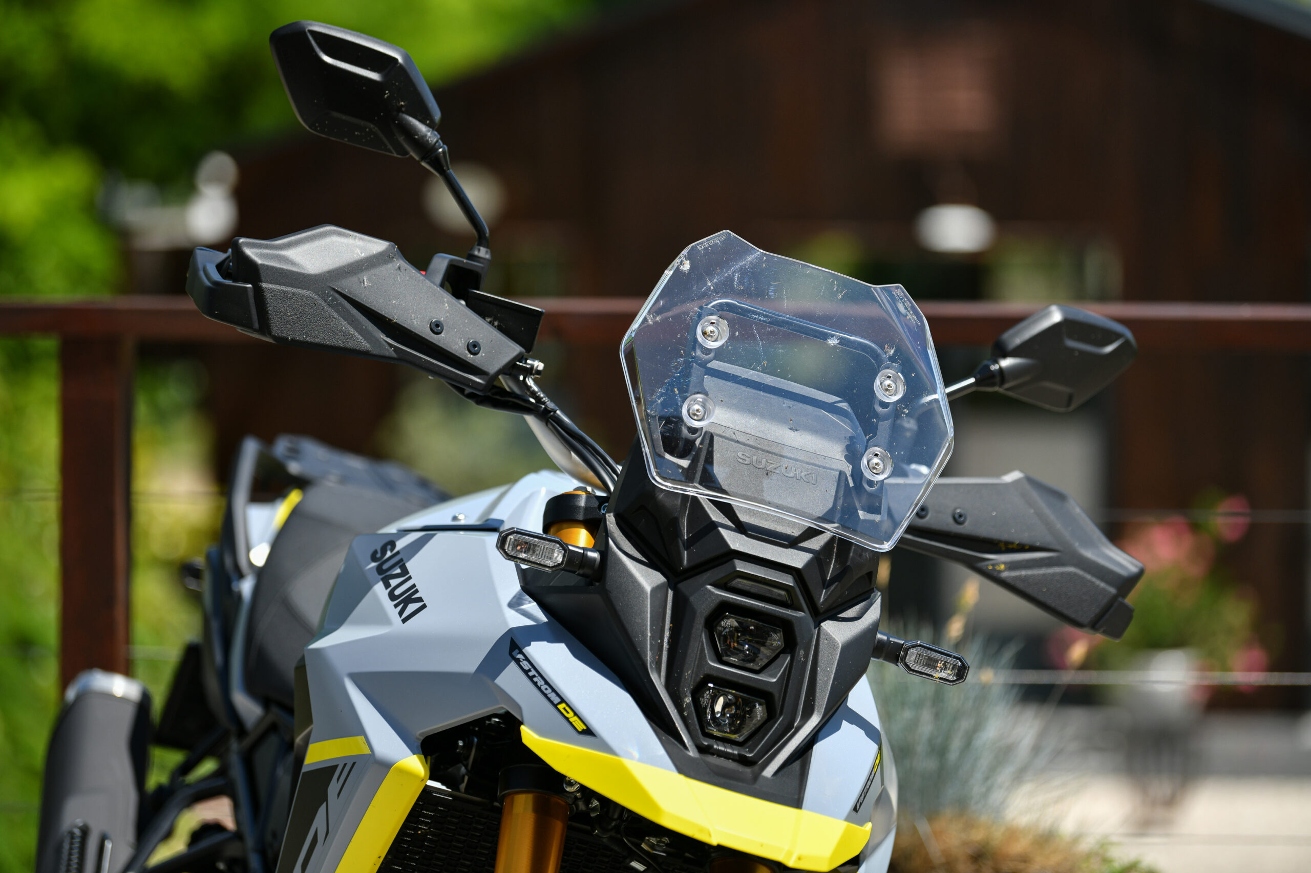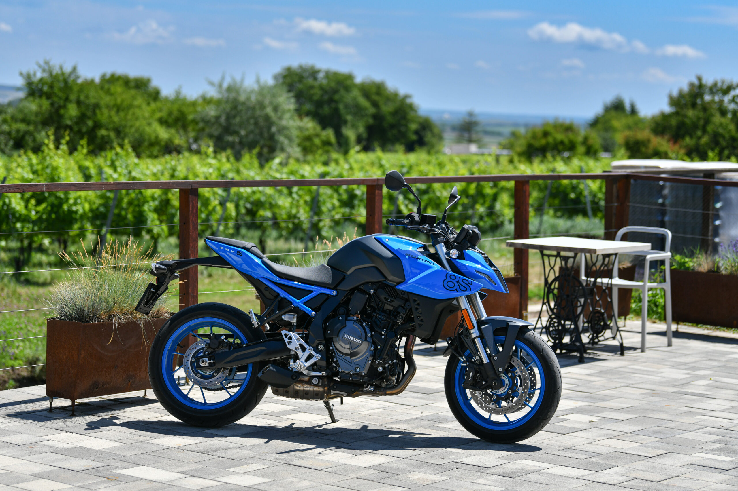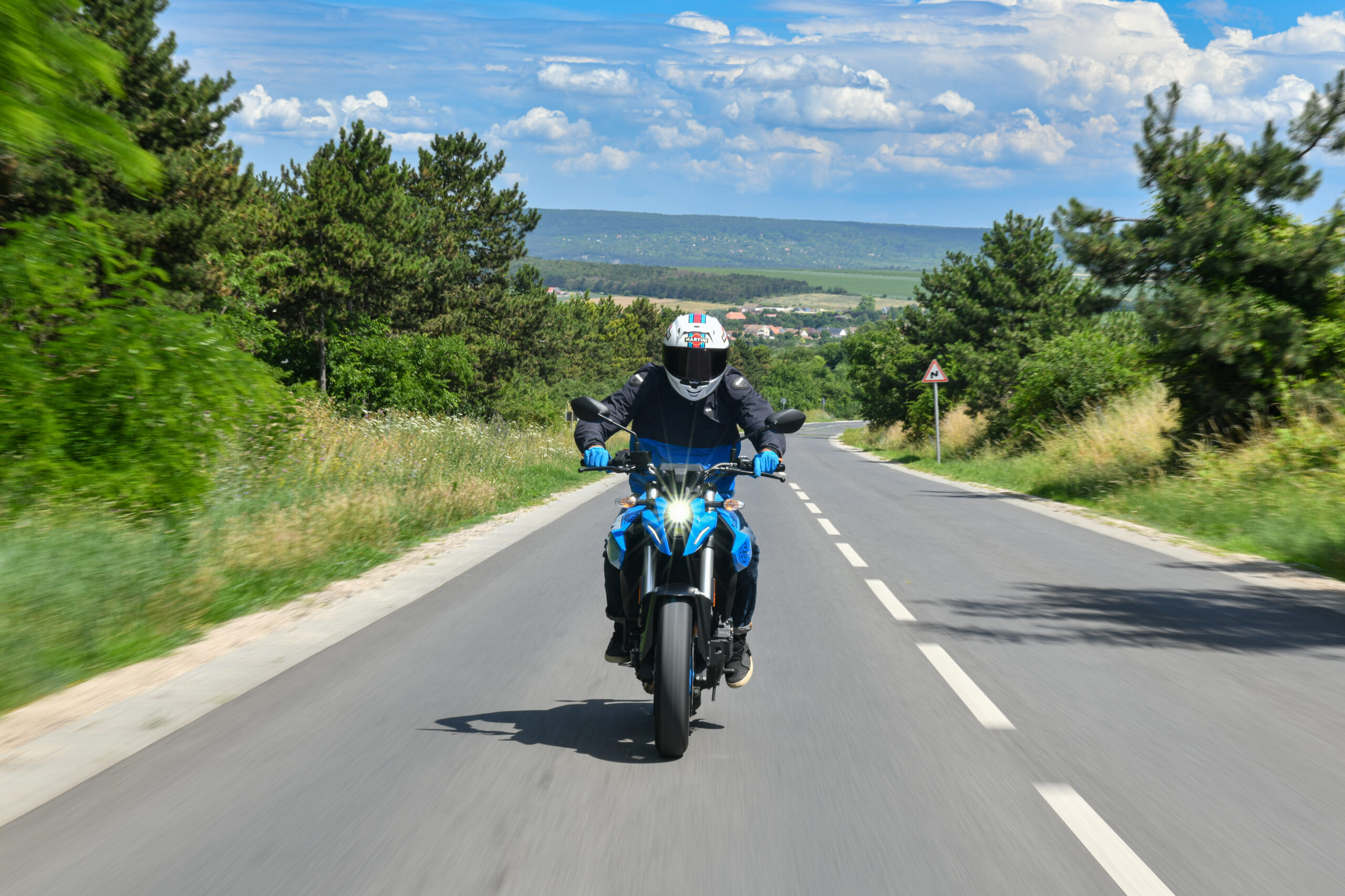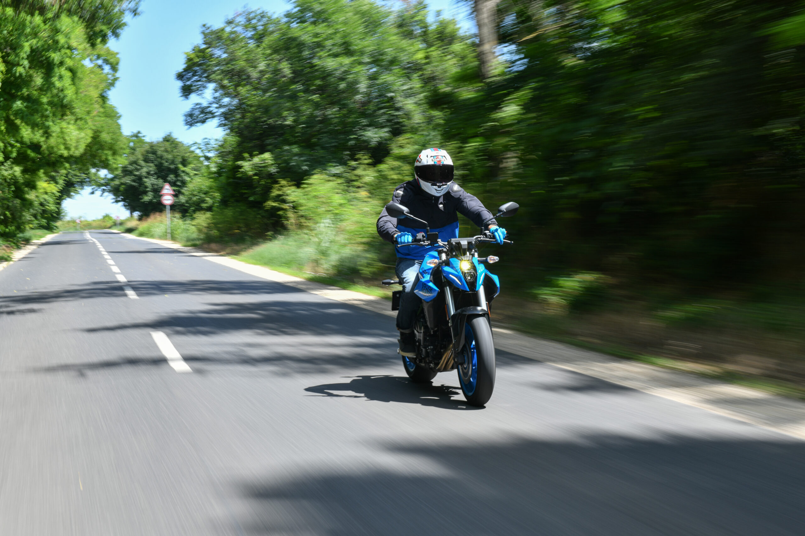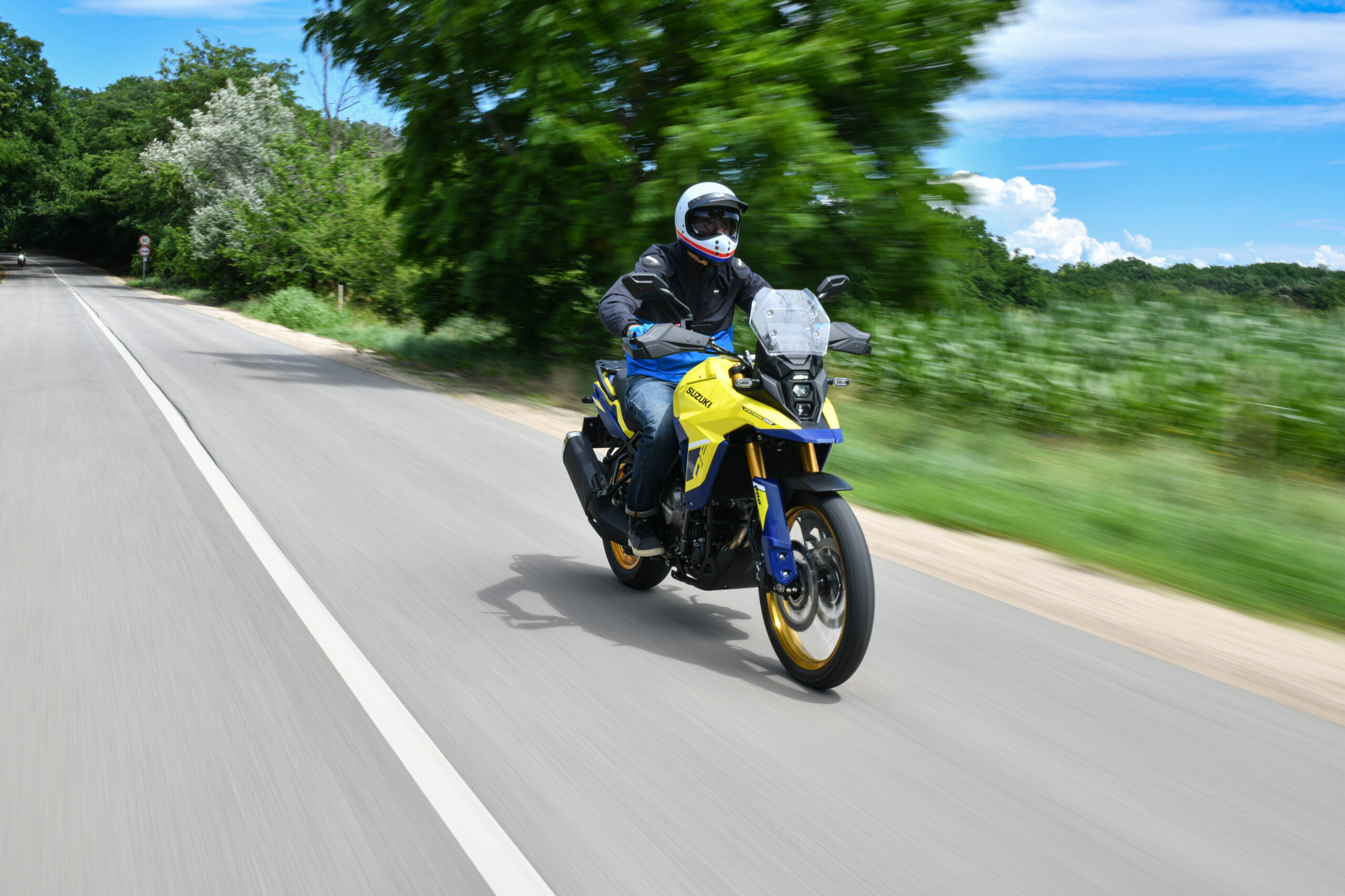 A nyeregbe pattanva az a különös, hogy nincs semmi különös. Jól ismert kapcsolók és modern tft műszerfal köszönnek vissza a mérsékelten sportos üléspozícióban. A menü egyszerűen kezelhető, a mentemódok sincsenek túlbonyolítva. De a Suzukikat nem is high-tech elektronika vagy kifinomult kidolgozás miatt kedveljük. Hanem az érzésre örökkévalóságnak készült technika miatt, és ezt az érzést a vadonatúj sorkettes is hozza. Az biztos, hogy nem spórolták ki az anyagot semmiből, mert a 202 kilós telitankolt súlyban manapság az ezres négyhengeresek vannak. Viszonylag hosszú lökete ellenére is tűri a forgatást, de leginkább a telt középtartomány és kifejezetten kulturált alsó tartomány miatt szerethető. Ezért nem szükséges állandóan a váltón szteppelni, harmadikban majdnem mindent megold. Én viszont nagyon is szerettem a váltót indokolatlanul használni, annyira jól működik mindkét irányba az alapfelszereltség részét képező gyorsváltó. Elhanyagolhatóan kevés rezgést érezni a kormányon és a lábtartókon, a hangja sem kiált rögtön sportdobért. A sima járás és az alacsony fordulati terhelhetőség a kettős kiegyensúlyozó tengelynek köszönhető. Ez a megoldás az általánosan használt szimpla tengelyhez képest többlet súllyal és komplexitással jár, ellenben sokkal flexibilisebbé teszi a teljesítményleadást. És valóban, városban akár hatodikban is elpöfög, ami egyáltalán nem általános tulajdonsága a kéthengeres motoroknak.