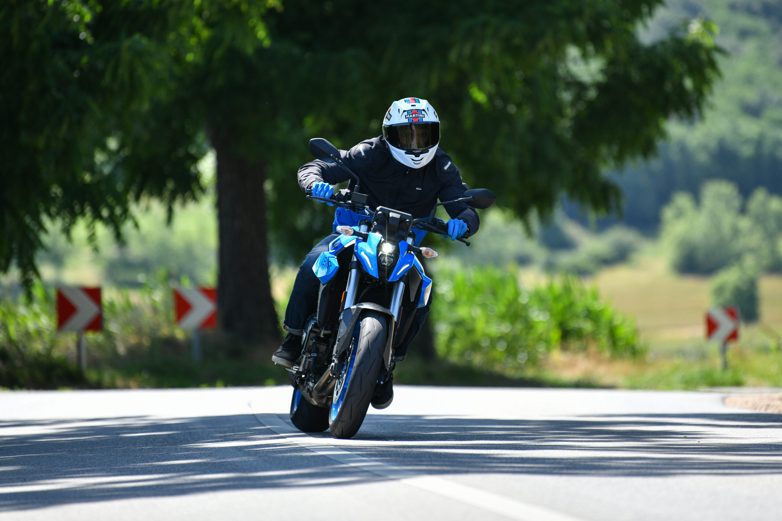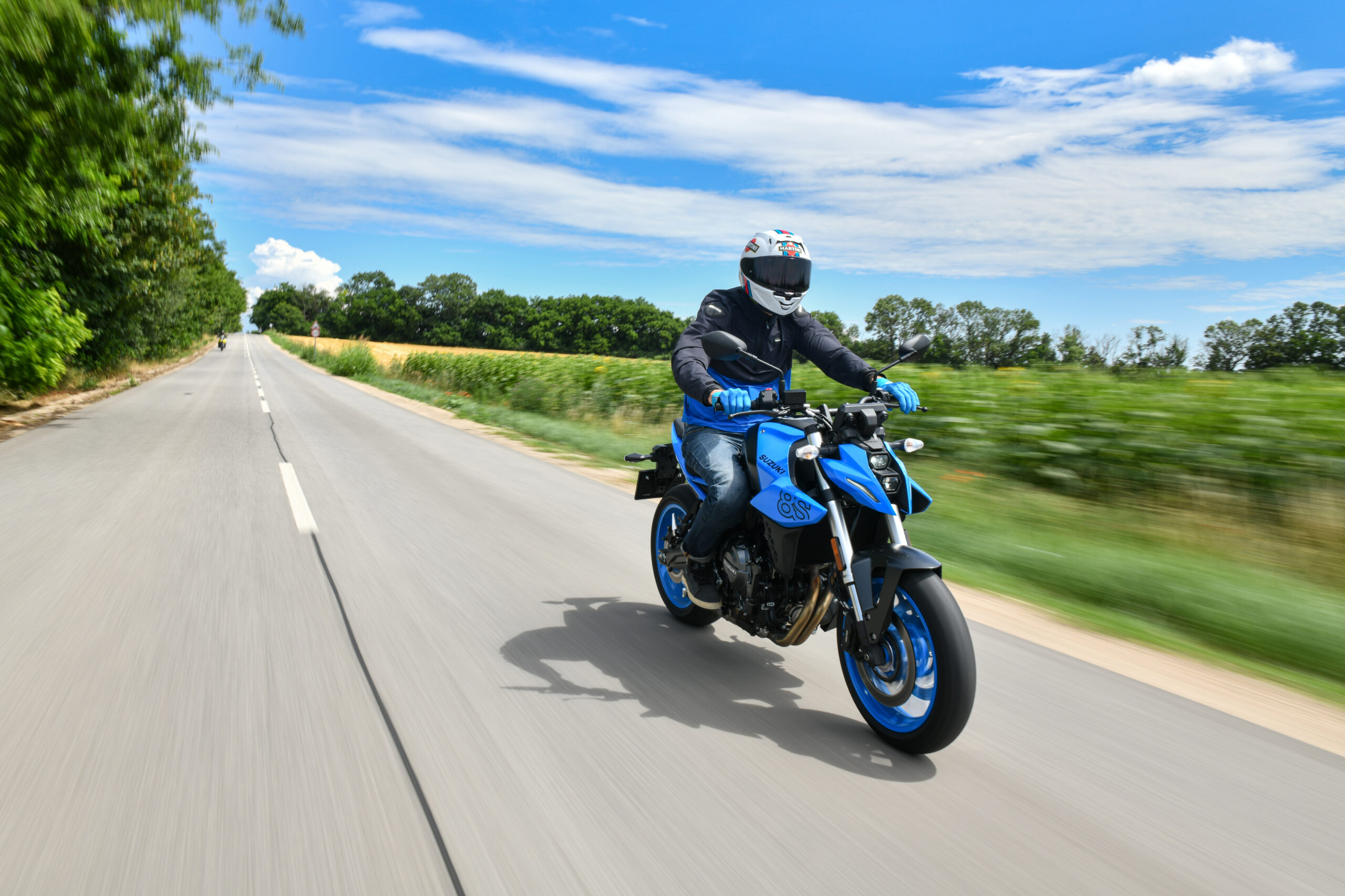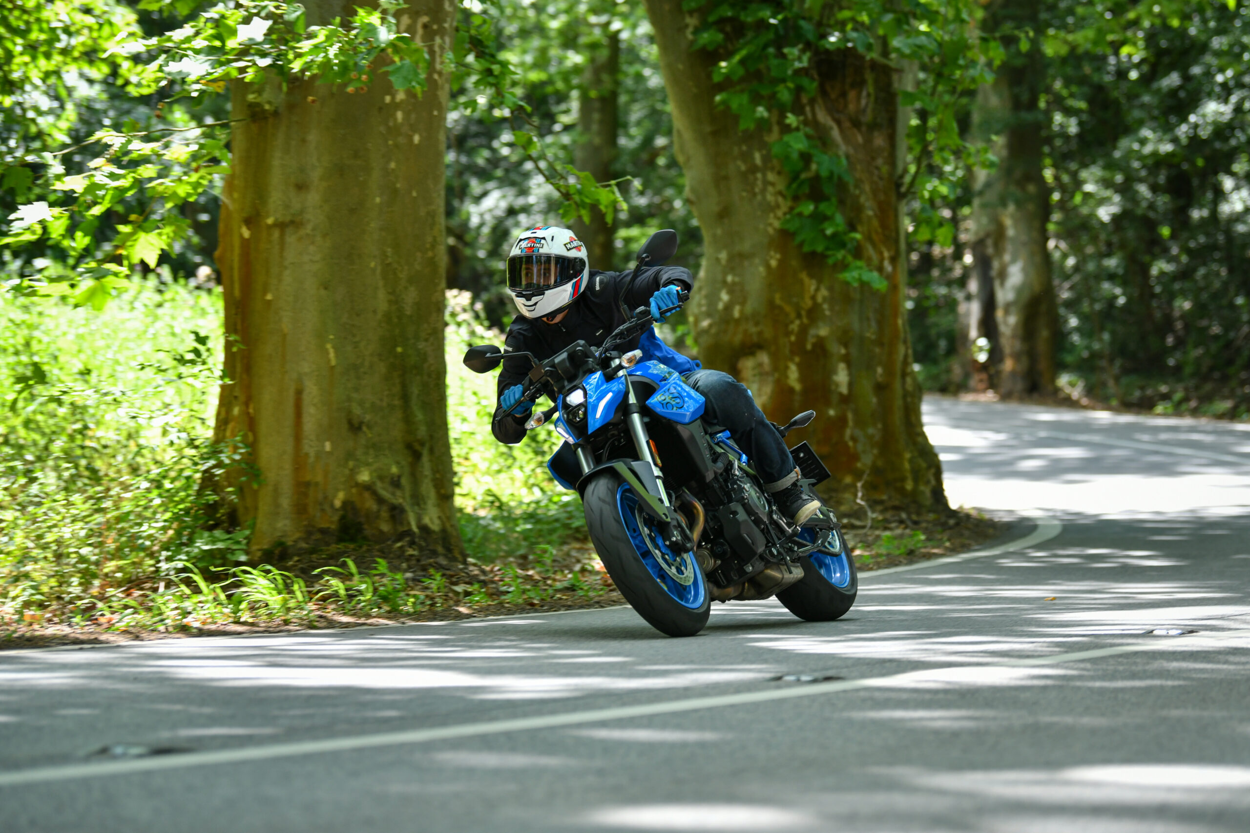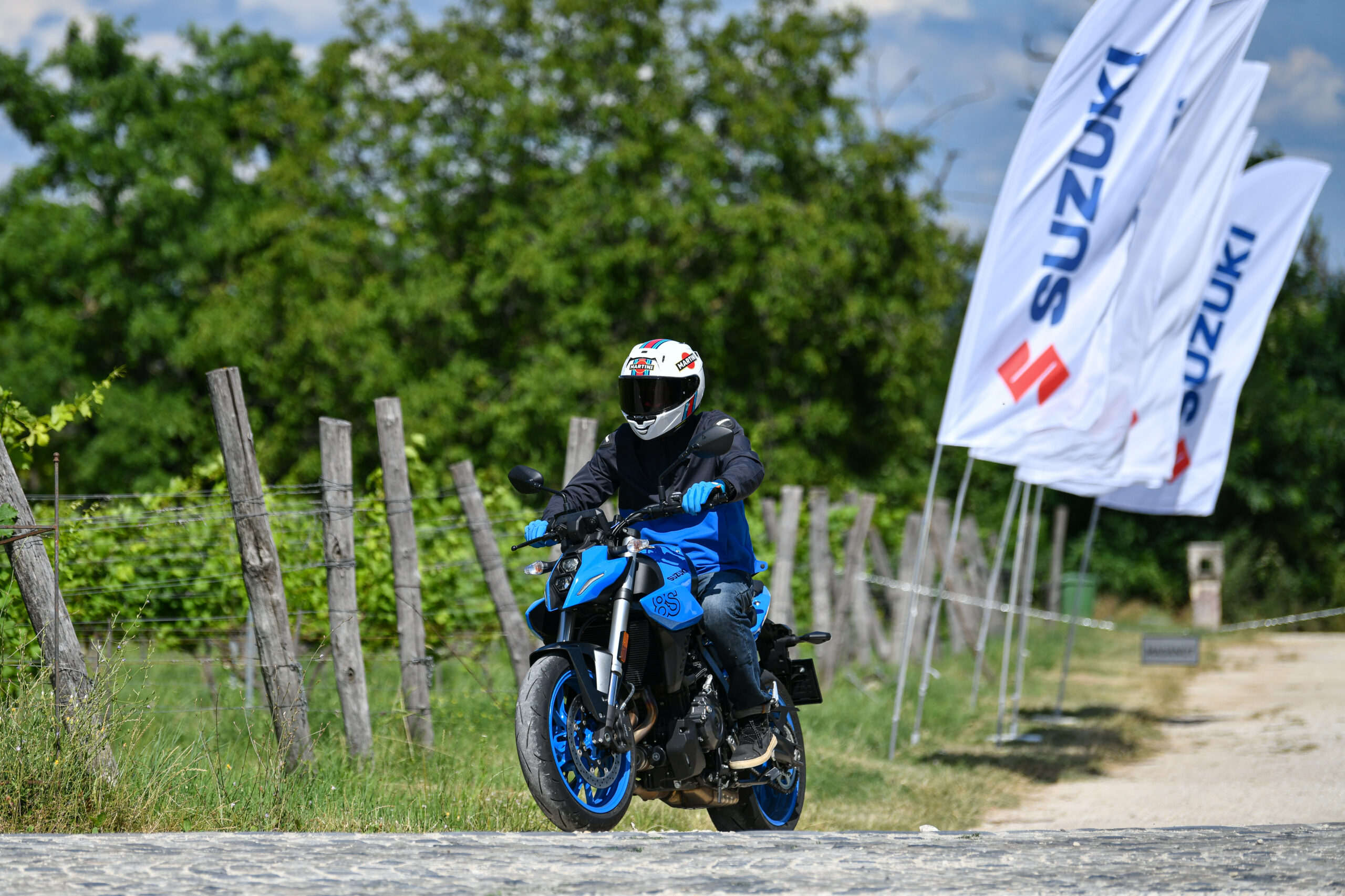 A nyeregbe pattanva az a különös, hogy nincs semmi különös. Jól ismert kapcsolók és modern tft műszerfal köszönnek vissza a mérsékelten sportos üléspozícióban. A menü egyszerűen kezelhető, a mentemódok sincsenek túlbonyolítva. De a Suzukikat nem is high-tech elektronika vagy kifinomult kidolgozás miatt kedveljük. Hanem az érzésre örökkévalóságnak készült technika miatt, és ezt az érzést a vadonatúj sorkettes is hozza. Az biztos, hogy nem spórolták ki az anyagot semmiből, mert a 202 kilós telitankolt súlyban manapság az ezres négyhengeresek vannak. Viszonylag hosszú lökete ellenére is tűri a forgatást, de leginkább a telt középtartomány és kifejezetten kulturált alsó tartomány miatt szerethető. Ezért nem szükséges állandóan a váltón szteppelni, harmadikban majdnem mindent megold. Én viszont nagyon is szerettem a váltót indokolatlanul használni, annyira jól működik mindkét irányba az alapfelszereltség részét képező gyorsváltó. Elhanyagolhatóan kevés rezgést érezni a kormányon és a lábtartókon, a hangja sem kiált rögtön sportdobért. A sima járás és az alacsony fordulati terhelhetőség a kettős kiegyensúlyozó tengelynek köszönhető. Ez a megoldás az általánosan használt szimpla tengelyhez képest többlet súllyal és komplexitással jár, ellenben sokkal flexibilisebbé teszi a teljesítményleadást. És valóban, városban akár hatodikban is elpöfög, ami egyáltalán nem általános tulajdonsága a kéthengeres motoroknak.