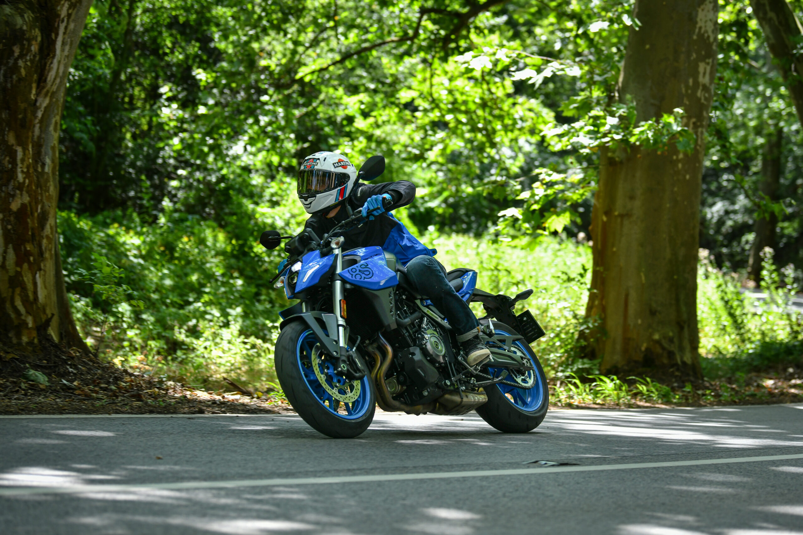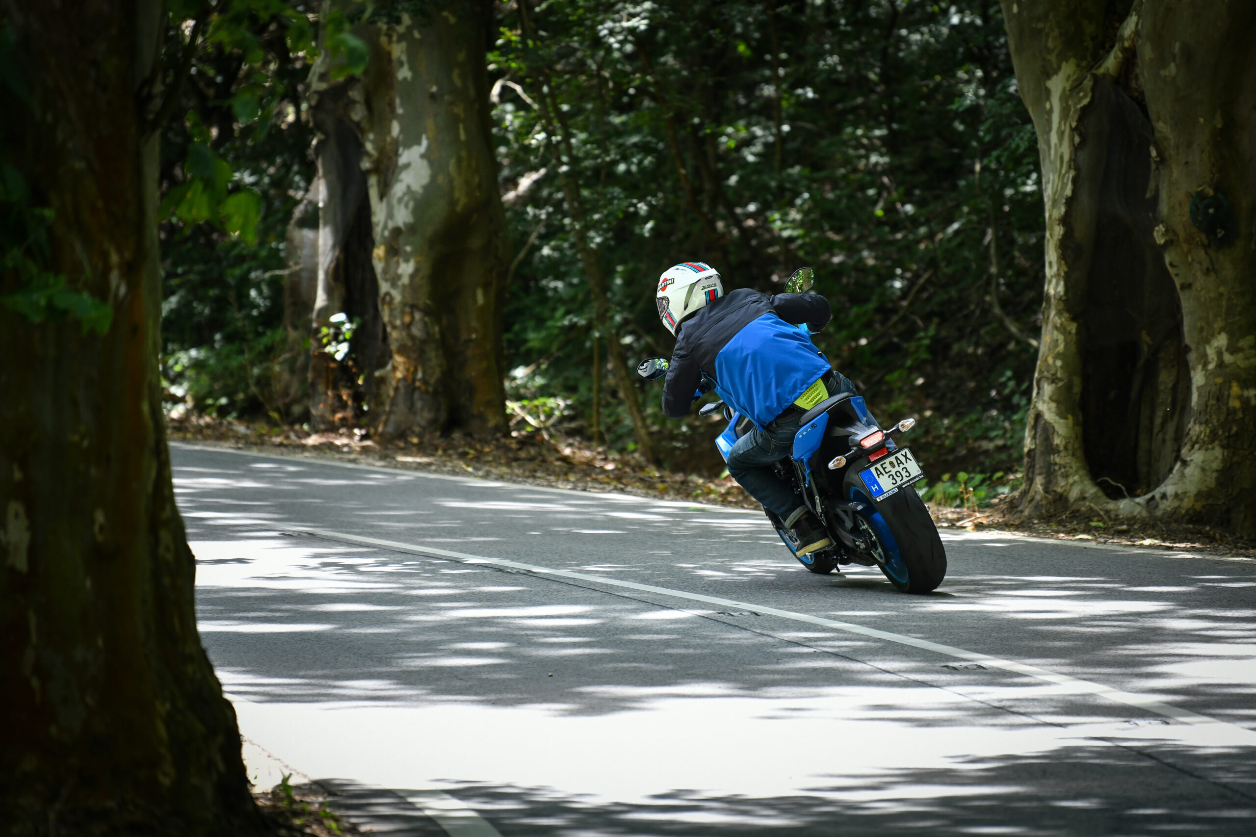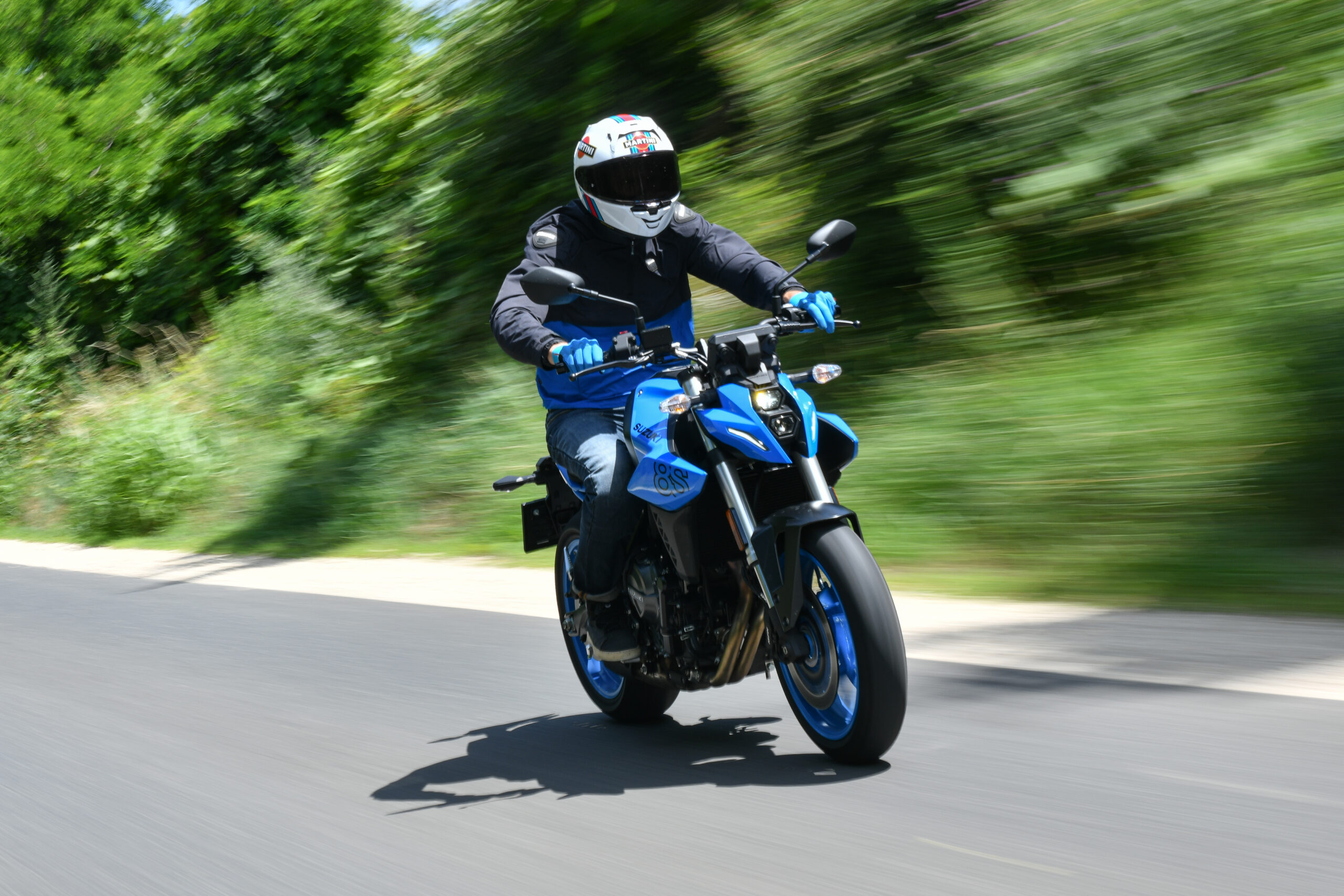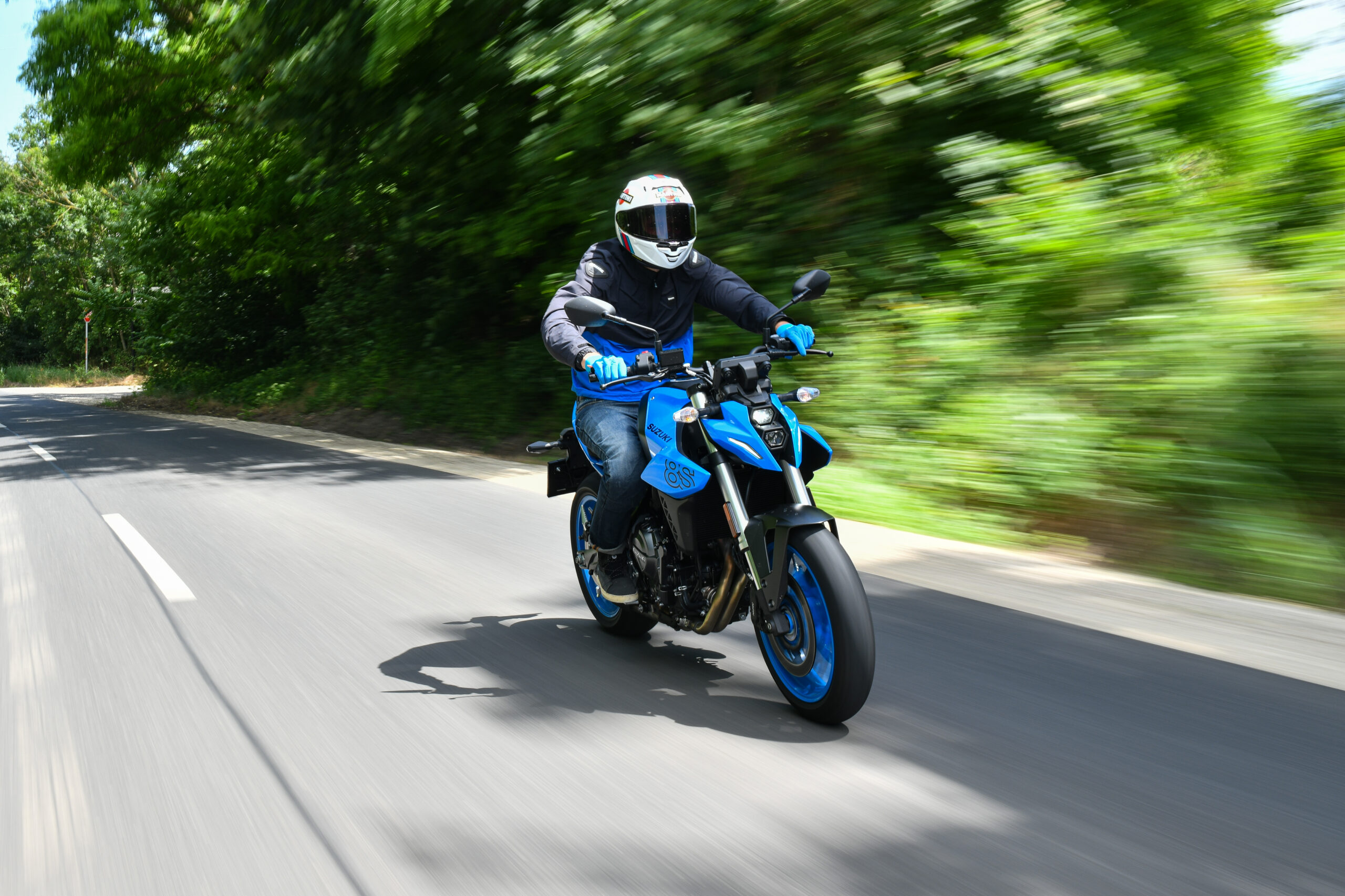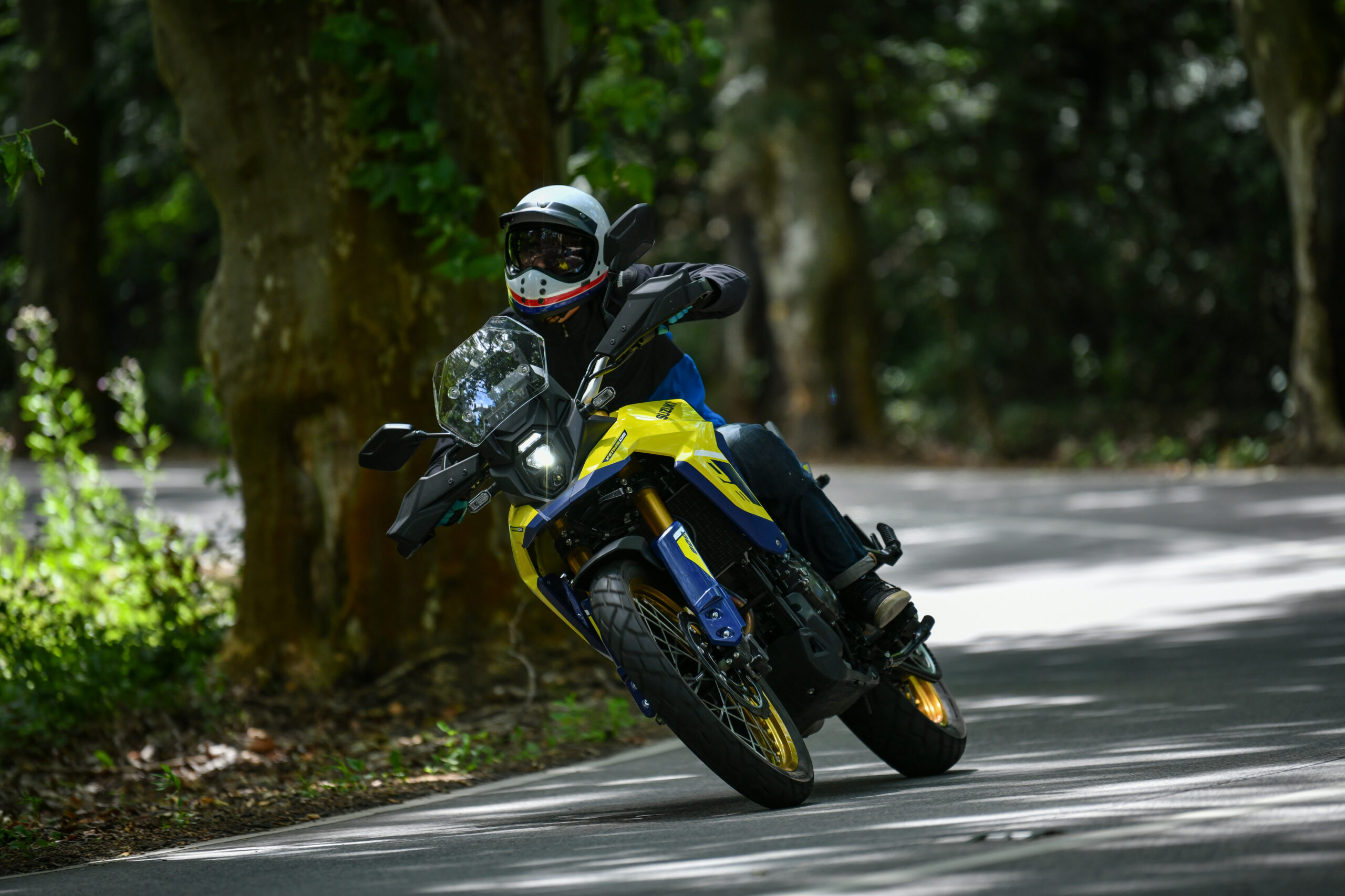 A nyeregbe pattanva az a különös, hogy nincs semmi különös. Jól ismert kapcsolók és modern tft műszerfal köszönnek vissza a mérsékelten sportos üléspozícióban. A menü egyszerűen kezelhető, a mentemódok sincsenek túlbonyolítva. De a Suzukikat nem is high-tech elektronika vagy kifinomult kidolgozás miatt kedveljük. Hanem az érzésre örökkévalóságnak készült technika miatt, és ezt az érzést a vadonatúj sorkettes is hozza. Az biztos, hogy nem spórolták ki az anyagot semmiből, mert a 202 kilós telitankolt súlyban manapság az ezres négyhengeresek vannak. Viszonylag hosszú lökete ellenére is tűri a forgatást, de leginkább a telt középtartomány és kifejezetten kulturált alsó tartomány miatt szerethető. Ezért nem szükséges állandóan a váltón szteppelni, harmadikban majdnem mindent megold. Én viszont nagyon is szerettem a váltót indokolatlanul használni, annyira jól működik mindkét irányba az alapfelszereltség részét képező gyorsváltó. Elhanyagolhatóan kevés rezgést érezni a kormányon és a lábtartókon, a hangja sem kiált rögtön sportdobért. A sima járás és az alacsony fordulati terhelhetőség a kettős kiegyensúlyozó tengelynek köszönhető. Ez a megoldás az általánosan használt szimpla tengelyhez képest többlet súllyal és komplexitással jár, ellenben sokkal flexibilisebbé teszi a teljesítményleadást. És valóban, városban akár hatodikban is elpöfög, ami egyáltalán nem általános tulajdonsága a kéthengeres motoroknak.