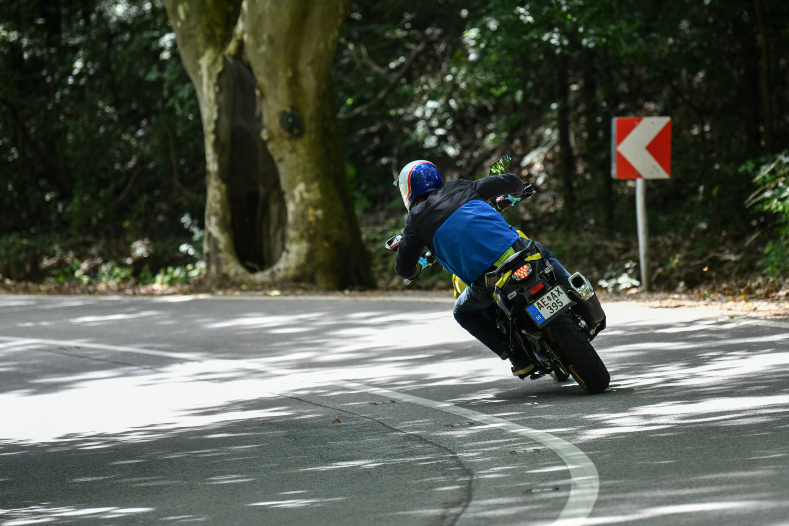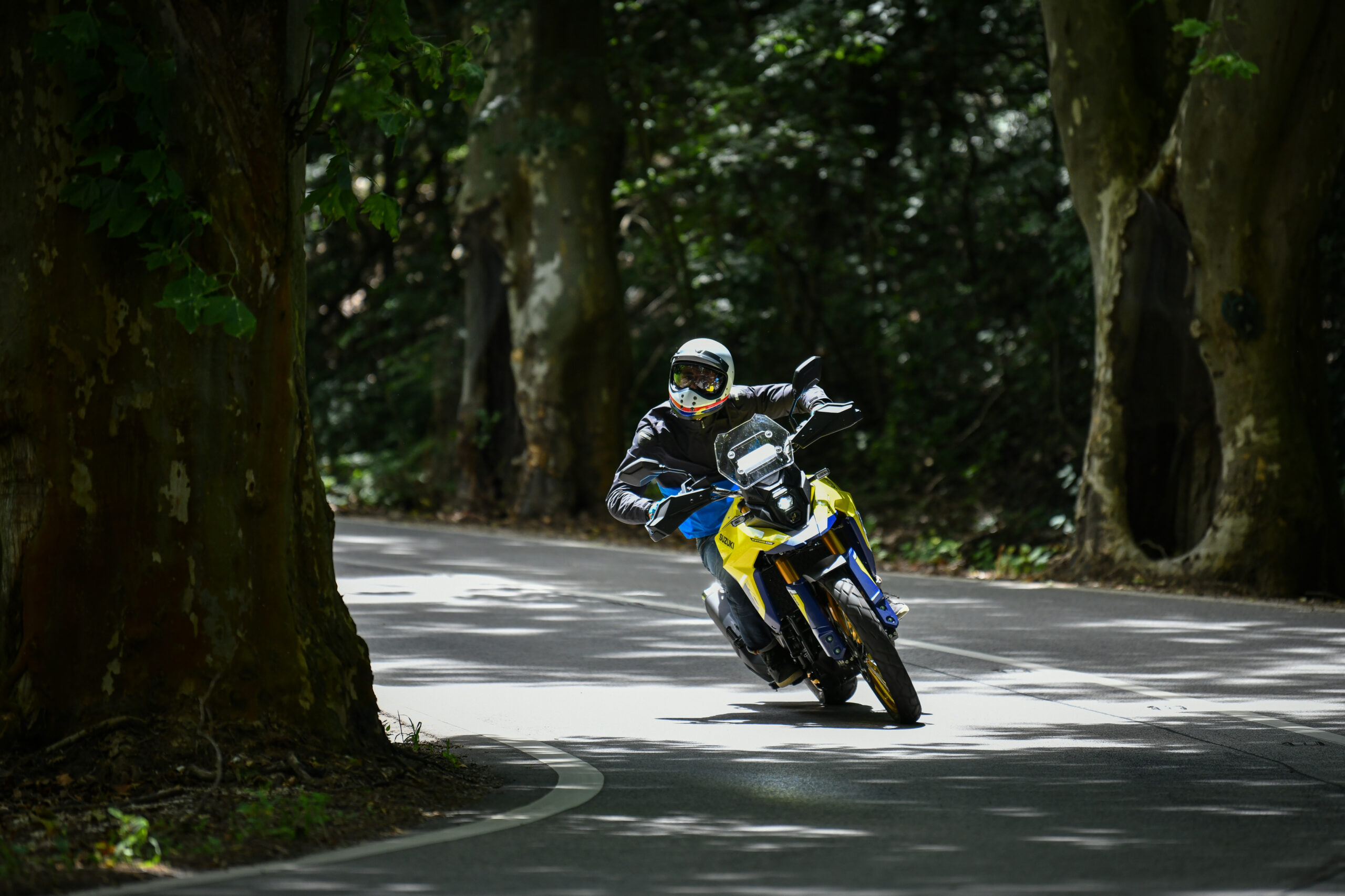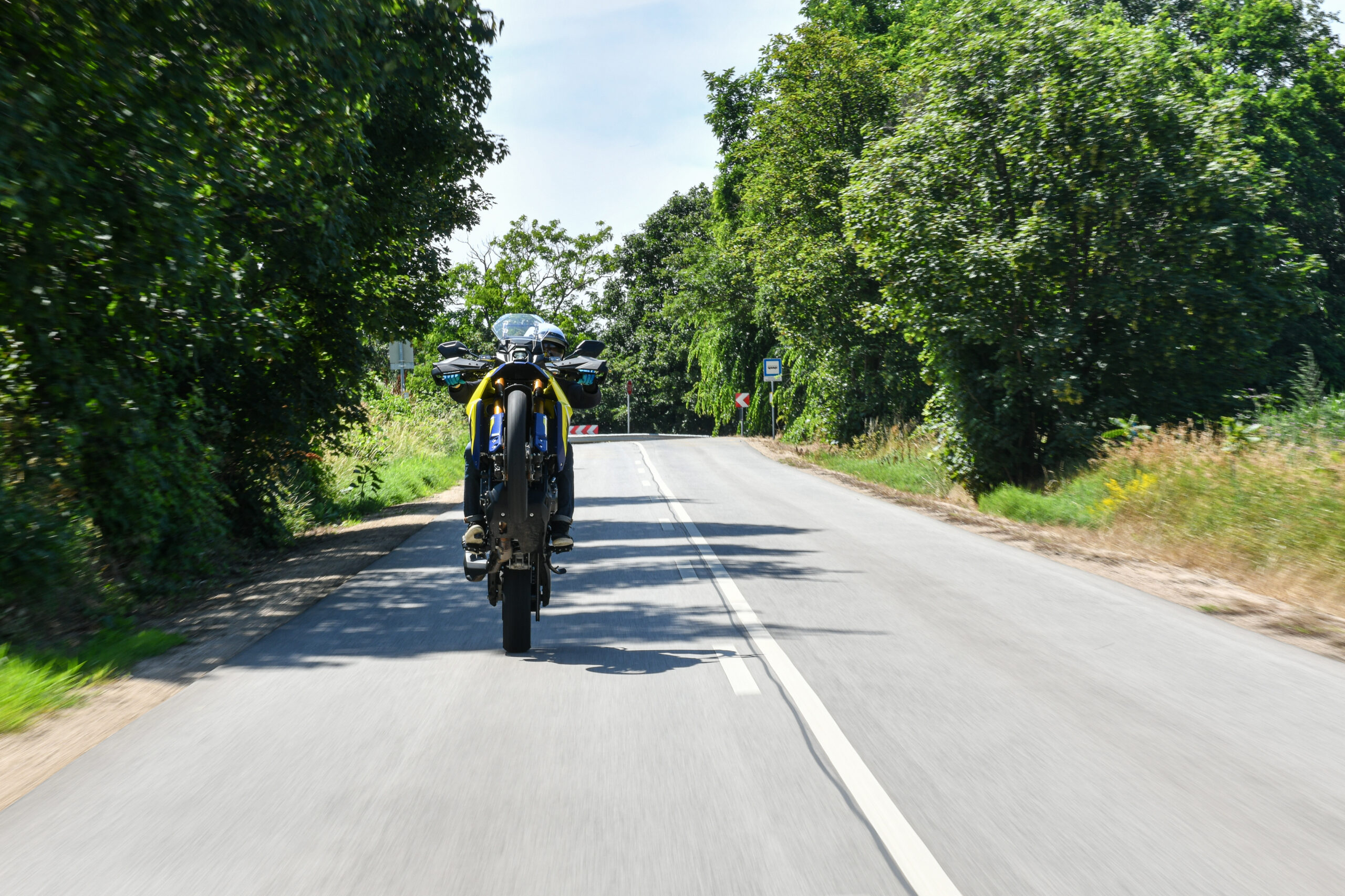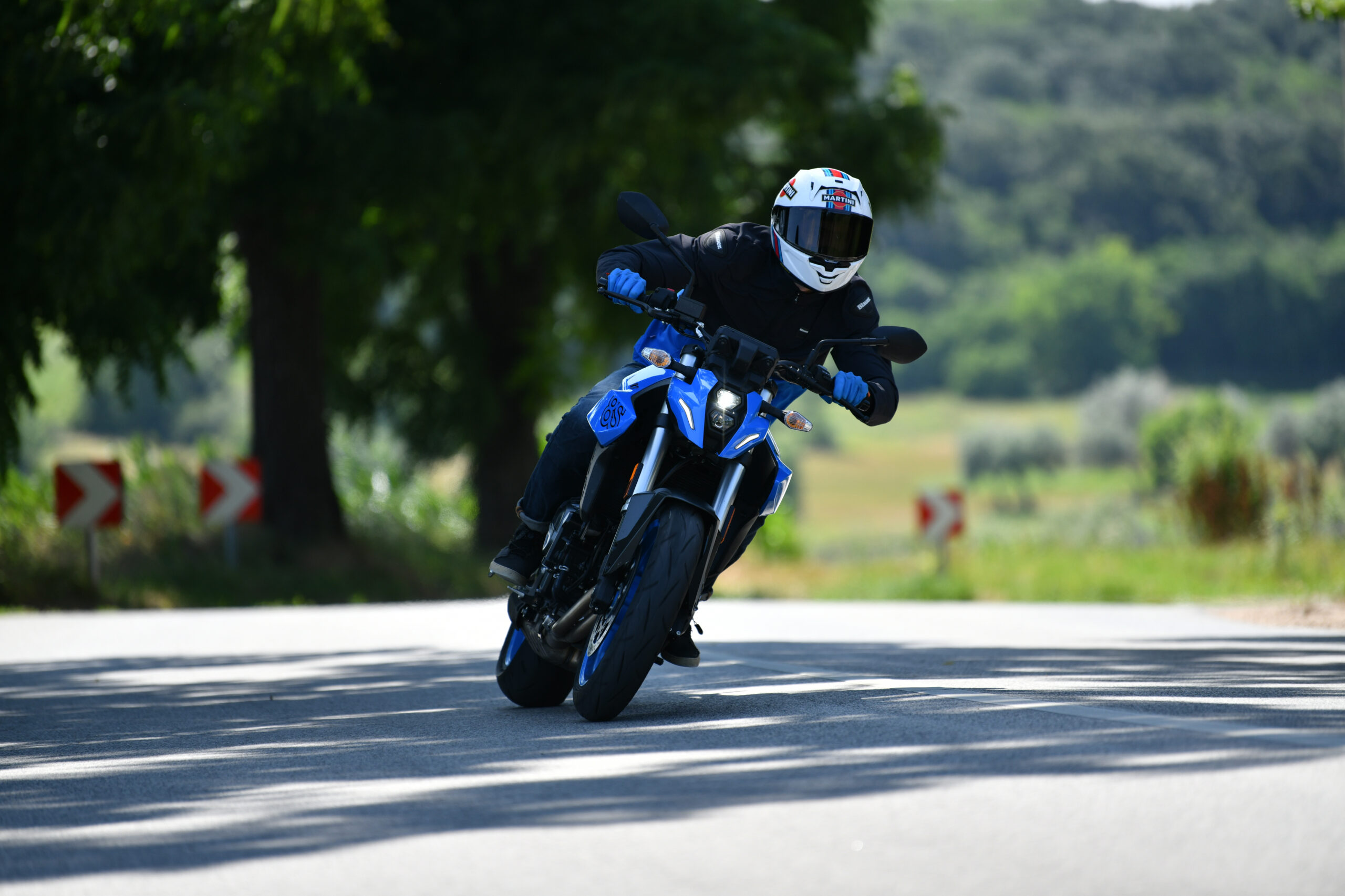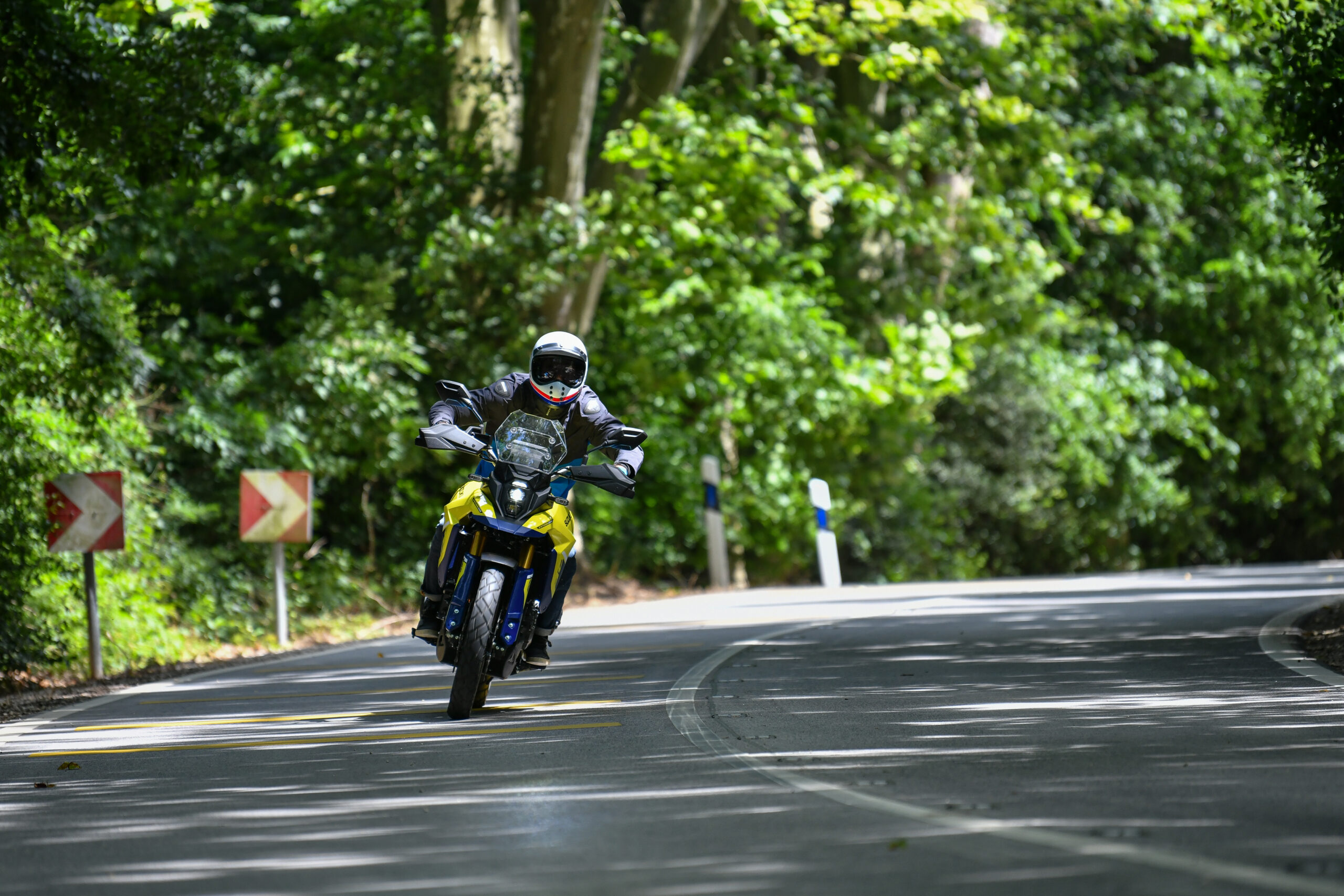 A nyeregbe pattanva az a különös, hogy nincs semmi különös. Jól ismert kapcsolók és modern tft műszerfal köszönnek vissza a mérsékelten sportos üléspozícióban. A menü egyszerűen kezelhető, a mentemódok sincsenek túlbonyolítva. De a Suzukikat nem is high-tech elektronika vagy kifinomult kidolgozás miatt kedveljük. Hanem az érzésre örökkévalóságnak készült technika miatt, és ezt az érzést a vadonatúj sorkettes is hozza. Az biztos, hogy nem spórolták ki az anyagot semmiből, mert a 202 kilós telitankolt súlyban manapság az ezres négyhengeresek vannak. Viszonylag hosszú lökete ellenére is tűri a forgatást, de leginkább a telt középtartomány és kifejezetten kulturált alsó tartomány miatt szerethető. Ezért nem szükséges állandóan a váltón szteppelni, harmadikban majdnem mindent megold. Én viszont nagyon is szerettem a váltót indokolatlanul használni, annyira jól működik mindkét irányba az alapfelszereltség részét képező gyorsváltó. Elhanyagolhatóan kevés rezgést érezni a kormányon és a lábtartókon, a hangja sem kiált rögtön sportdobért. A sima járás és az alacsony fordulati terhelhetőség a kettős kiegyensúlyozó tengelynek köszönhető. Ez a megoldás az általánosan használt szimpla tengelyhez képest többlet súllyal és komplexitással jár, ellenben sokkal flexibilisebbé teszi a teljesítményleadást. És valóban, városban akár hatodikban is elpöfög, ami egyáltalán nem általános tulajdonsága a kéthengeres motoroknak.