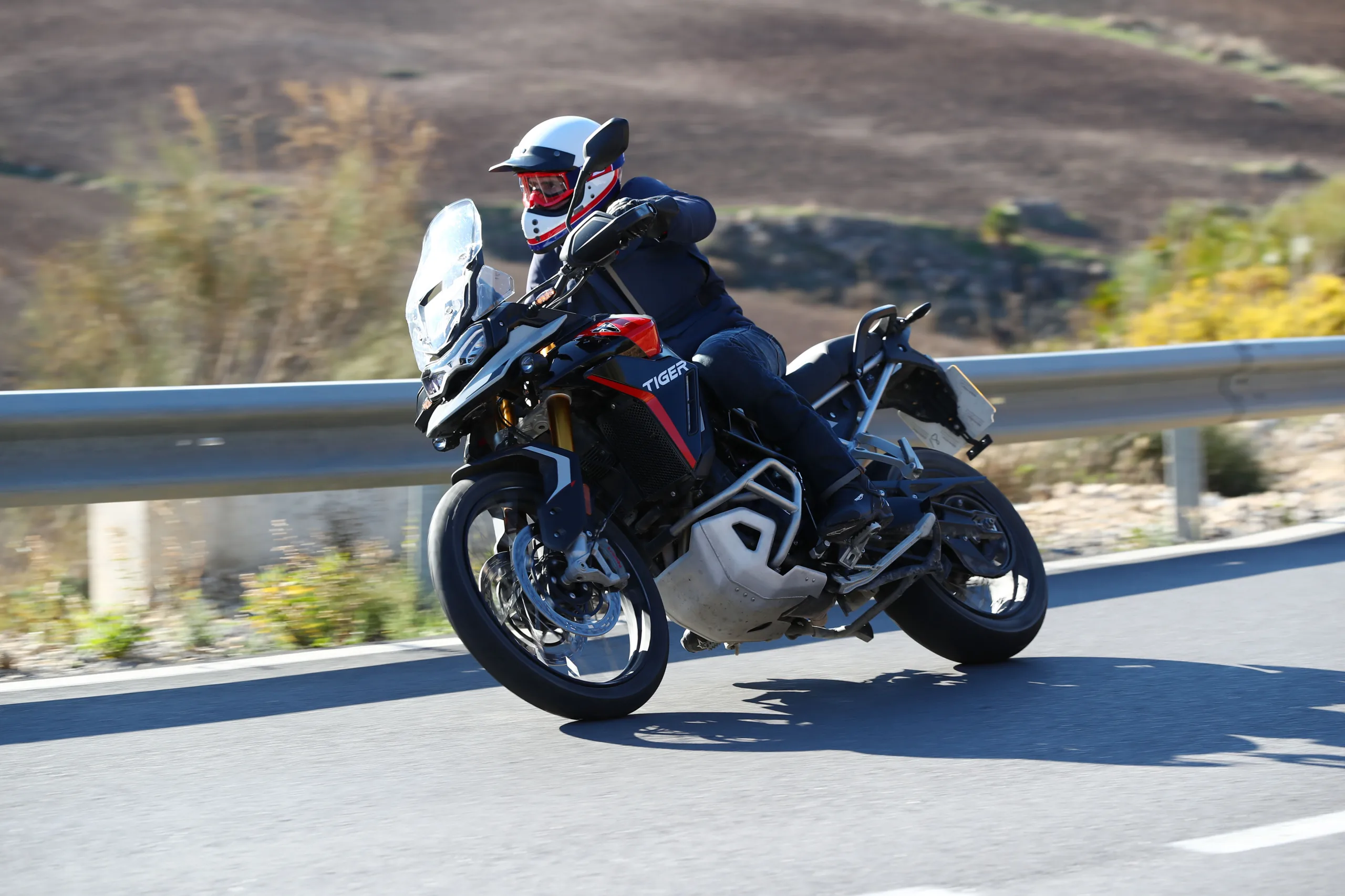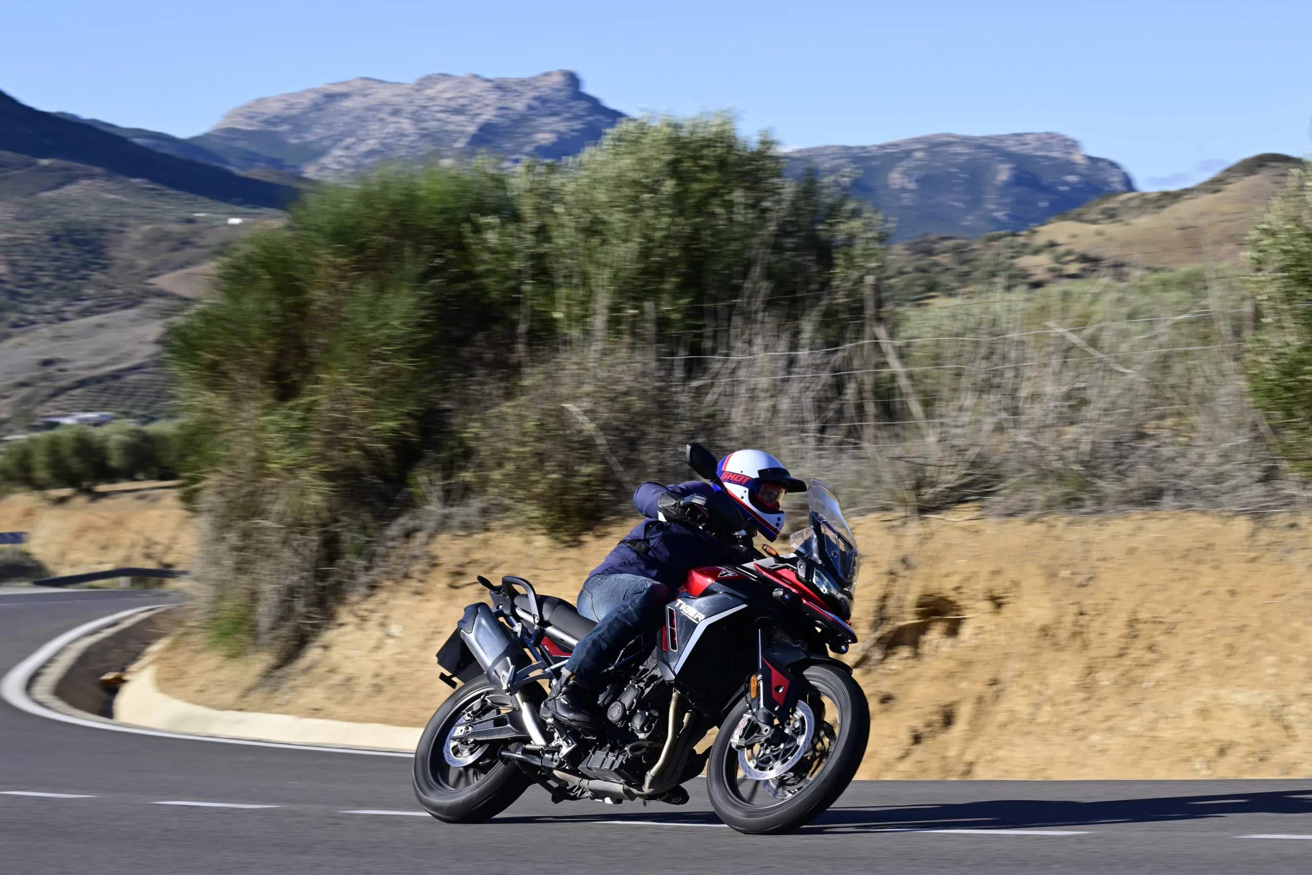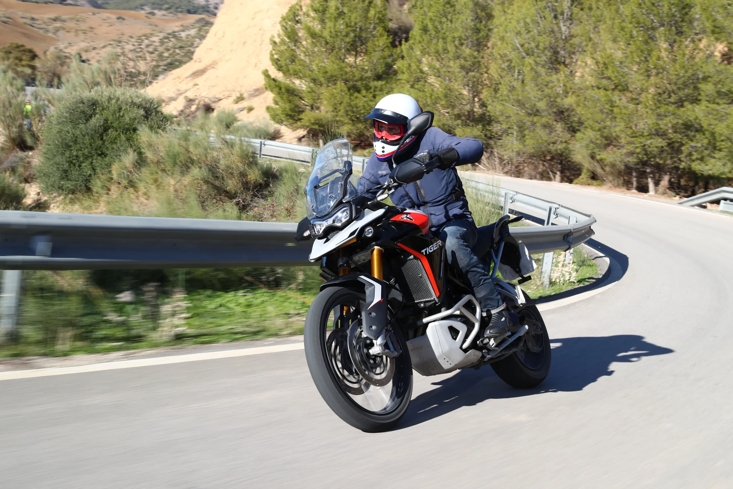 Hiszen, ha sokat motorozol, előbb-utóbb igényed lesz a kényelemre, és a magas építés miatt az útminőséget is figyelmen kívül hagyhatod az útvonal-tervezéskor. Szóval, ha nem vagy különösebben mély növésű, egy modern bokorugró az maga a szabadság. Ingázhatsz velük melóba hűvös reggeleken, de a Balkán burkolatot csak nyomokban útjait is felfedezheted. A 2020 óta piacon lévő Tiger 900-al lenyomtam a megjelenés évében egy klasszik horvát nyolcas utat, és fél évvel a mostani teszt előtt ugyanitt motoroztunk Malaga környékén a barátaimmal a frissítés előtti modellekkel. Mivel mindkét túrán volt a csapatban erősebb motor, némileg több tűzerő igencsak jól jött volna, hogy ne kelljen folyton kifacsarni a 95 lóerős háromhengerest. Ami mellesleg az egyik legjobb karakterű blokk, amit manapság motorkerékpárba építenek. A normál triplákhoz képest (pl. Street Triple) a fő különbség, hogy a 900-as és az 1200-as Tigerek főtengelyén a hajtókarok T-alakban vannak elrendezve. Ez egyenetlen gyújtássorrendet eredményez, amitől leginkább egy V4-eshez hasonlít a hangja.