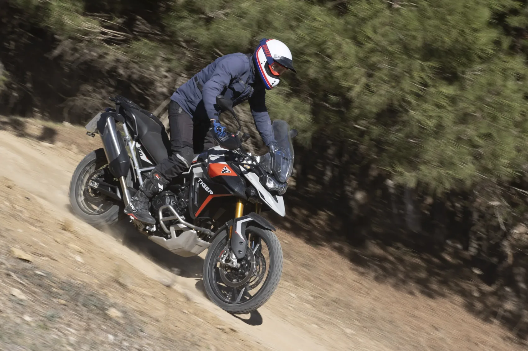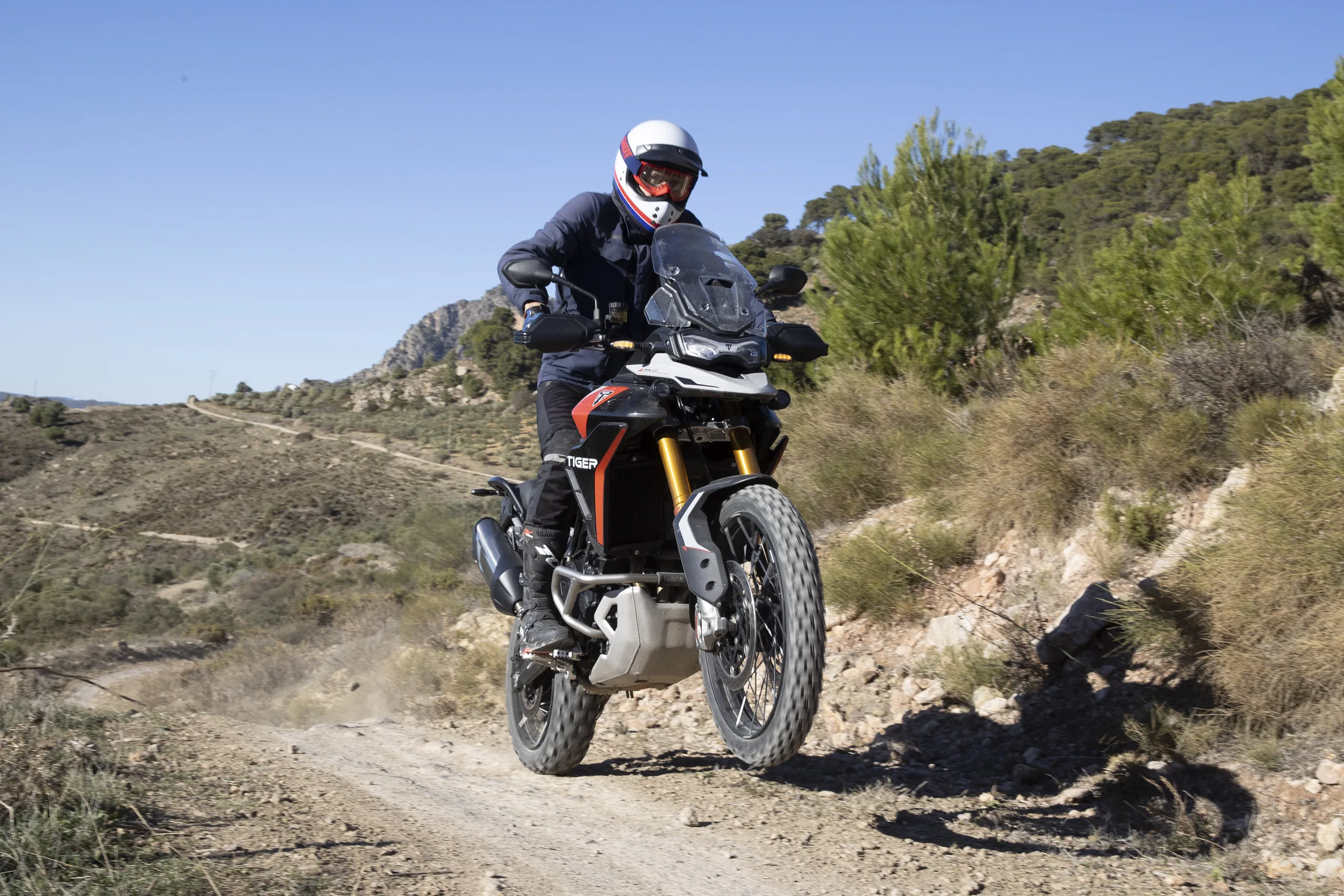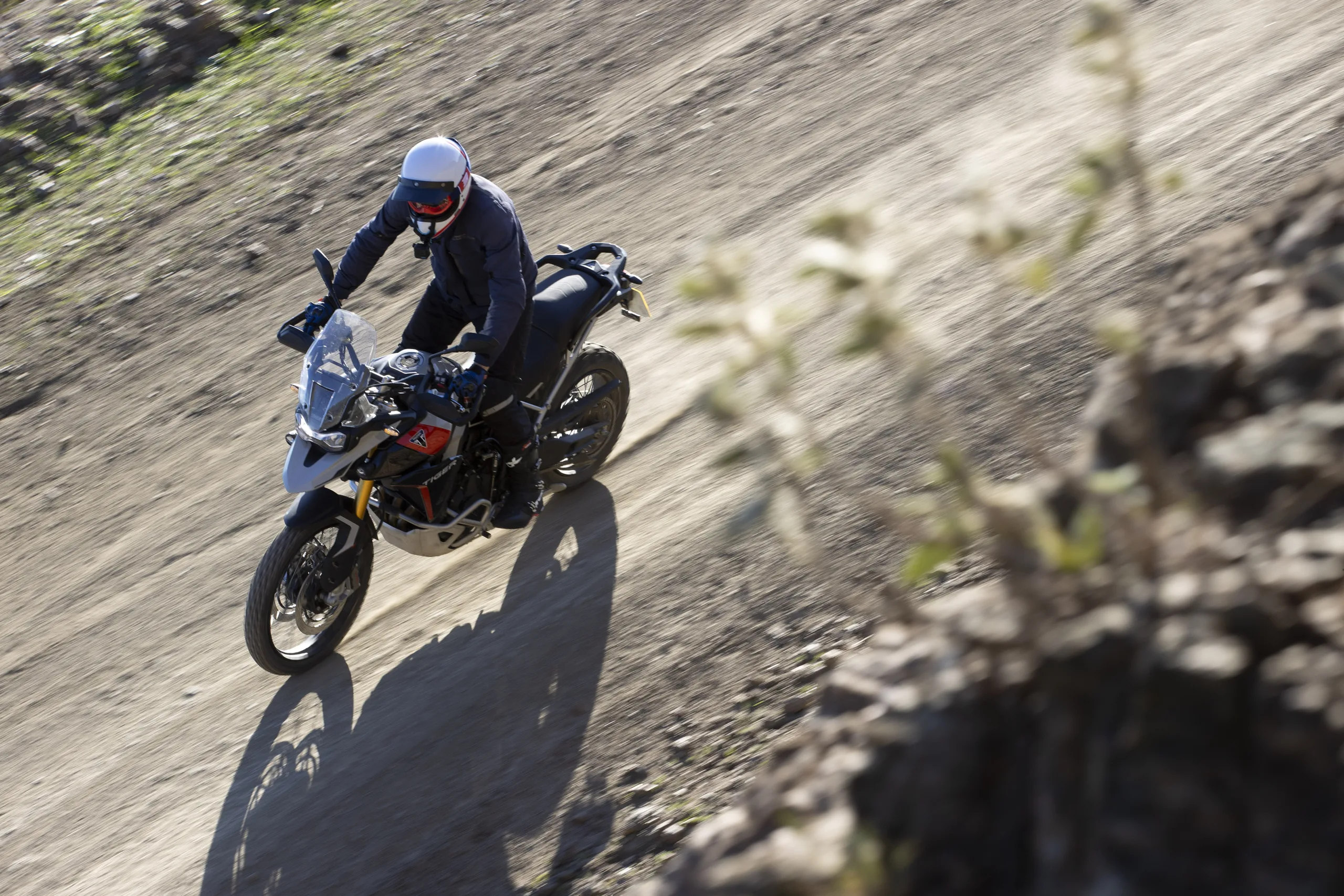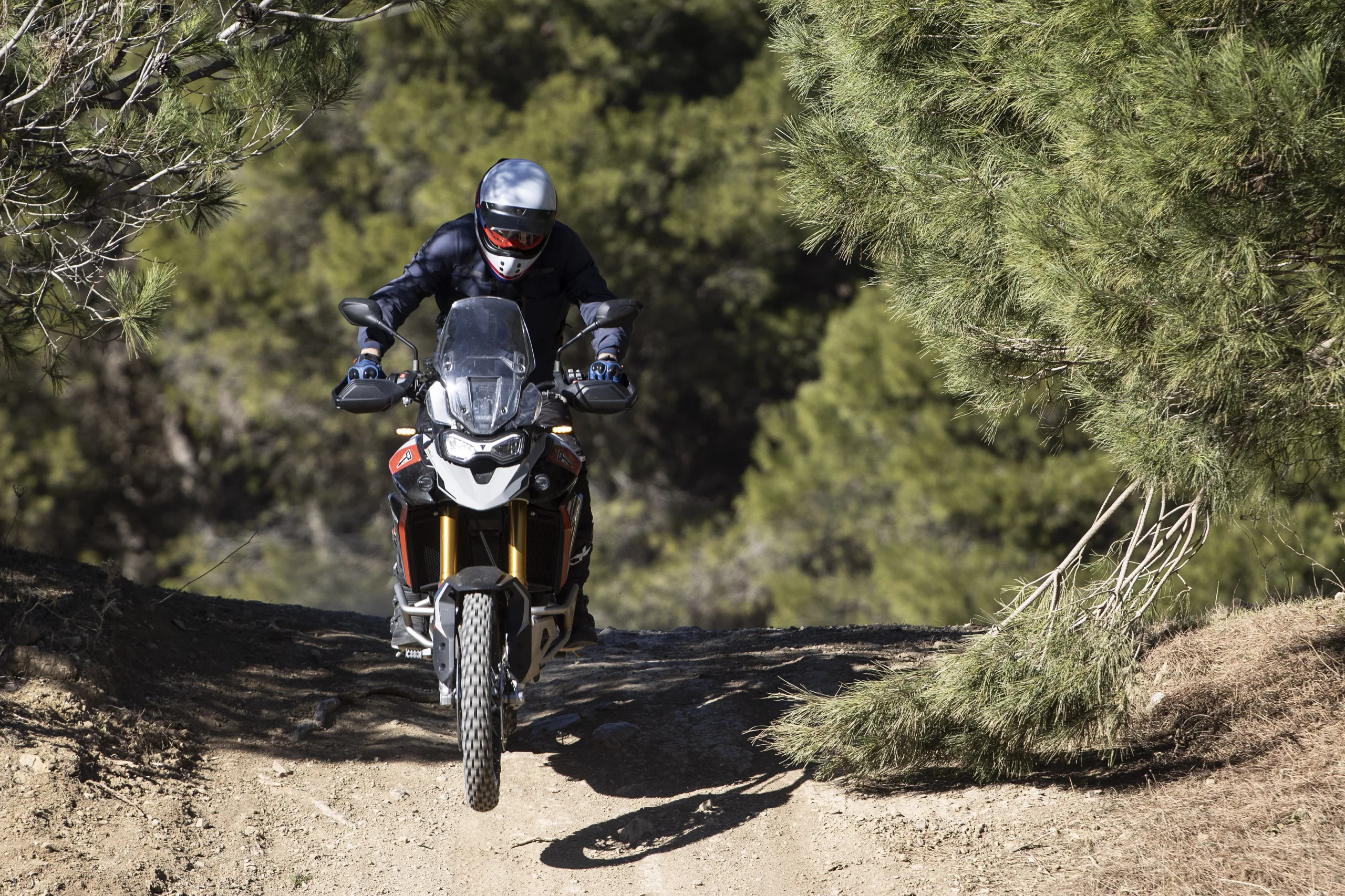 Első nap 120 kilométernyi terepmotorozás várt ránk az alkalomhoz illően gumizott Rally Pro változattal. Ennek a futóművét továbbra is a Showa szállítja, melyek hatvan milliméterrel hosszabb rugóúton dolgoznak (240/230 mm) a GT modellek Marzocchi gyártmányainál. Ezáltal az ülésmagasság az alacsonyabb pozícióban is 20 milliméterrel magasabb a GT-nél. Hogy ez mennyire kritikus jelentőségű, azt csak az első etap után tudtam meg. Ugyanis az alap ülésmagasság a 15 miliméterel közelebb került kormánnyal számomra furán „csopperes” testtartást eredményezett a körülbelül 185 centis magasságommal. A felfekvő rudakat kézzel húsz milivel magasabb pozícióba helyezve viszont mintha másik motorra ültem volna! Nemcsak az üléspozíció lett sokkal természetesebb, állva is sokkal jobban érezhető a motor mozgása laza talajon, ha nagyobb felületen tudom szorítani a lábammal. Márpedig gyakorlatilag egyfolytában állva motoroztunk a kavicsos, sokszor köves földutakon és ösvényeken. Ilyen körülmények között persze nem igazán tapasztaltuk meg a nagyobb teljesítményt, ellenben a blokk barátságos karakterével és a kipörgés-gátló hasznosságával. A gázreakció kellően közvetlen, mégis kiválóan adagolható. A T elrendezésű főtengely egyik fő előnye, hogy a keréknek két impulzus (gyűjtás) között több ideje van megtapadni, ezt a tulajdonságát pedig legfőképpen folyamatosan csúszó hátsó kerékkel lehet kiaknázni.