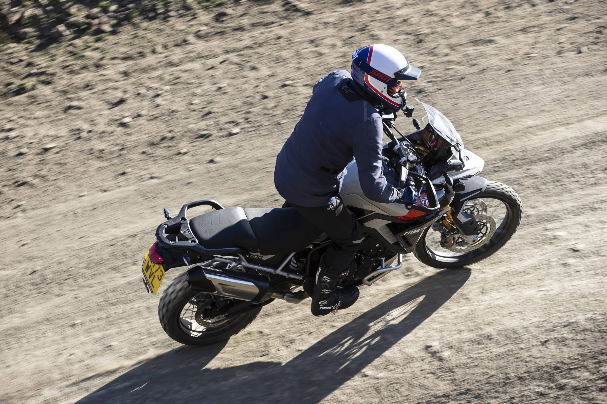 A Rally Pro tömlő nélküli 21/17 collos fűzött felnijeivel és jóval hosszabb rugóúttal rendelkező Showa futóművével komolyabb terepes bevetésre is alkalmas. (Fotó: Triumph)