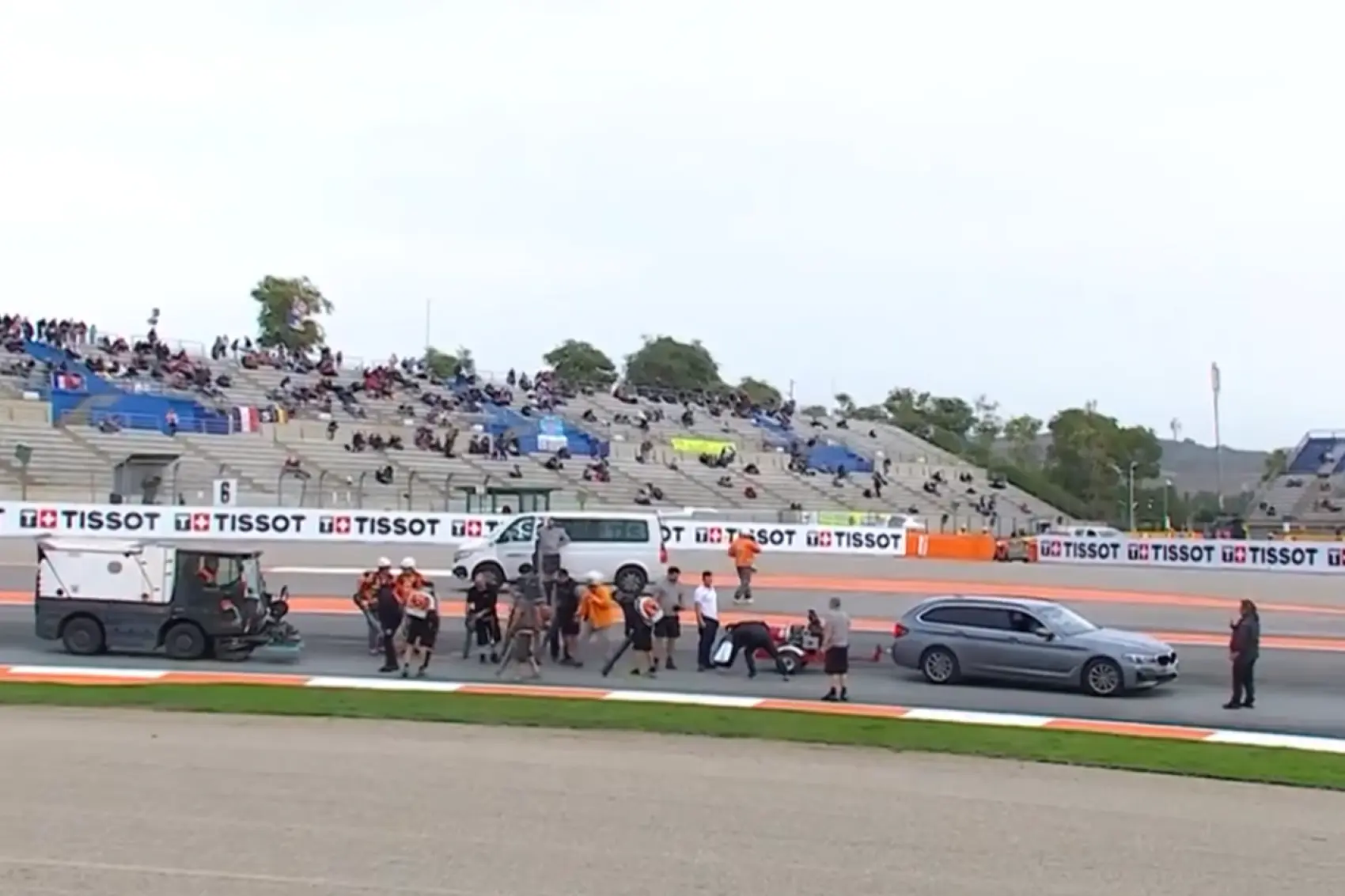 Huszonöt perccel később, 11:10-kor kezdődik a MotoGP első szabadedzése Valenciában. Ennek az az oka, hogy a Moto2 délelőtti tréningjén Adrián Huertas motorja produkált egy hatalmas highside-ot, majd nem sokkal később Ayumu Sasaki is eldobta. Előbbi versenyzőt ráadásul hordágyon kellett levinni, utóbbi fel tudott tápászkodni. A bukásokat követően pedig hosszasan takarították a pályát.