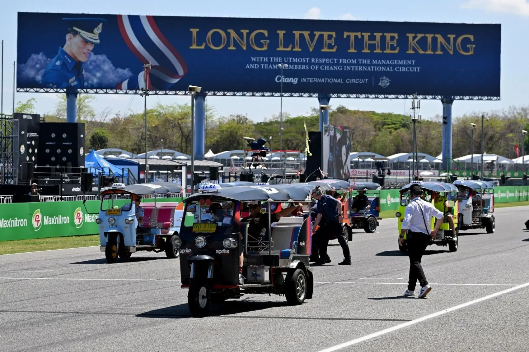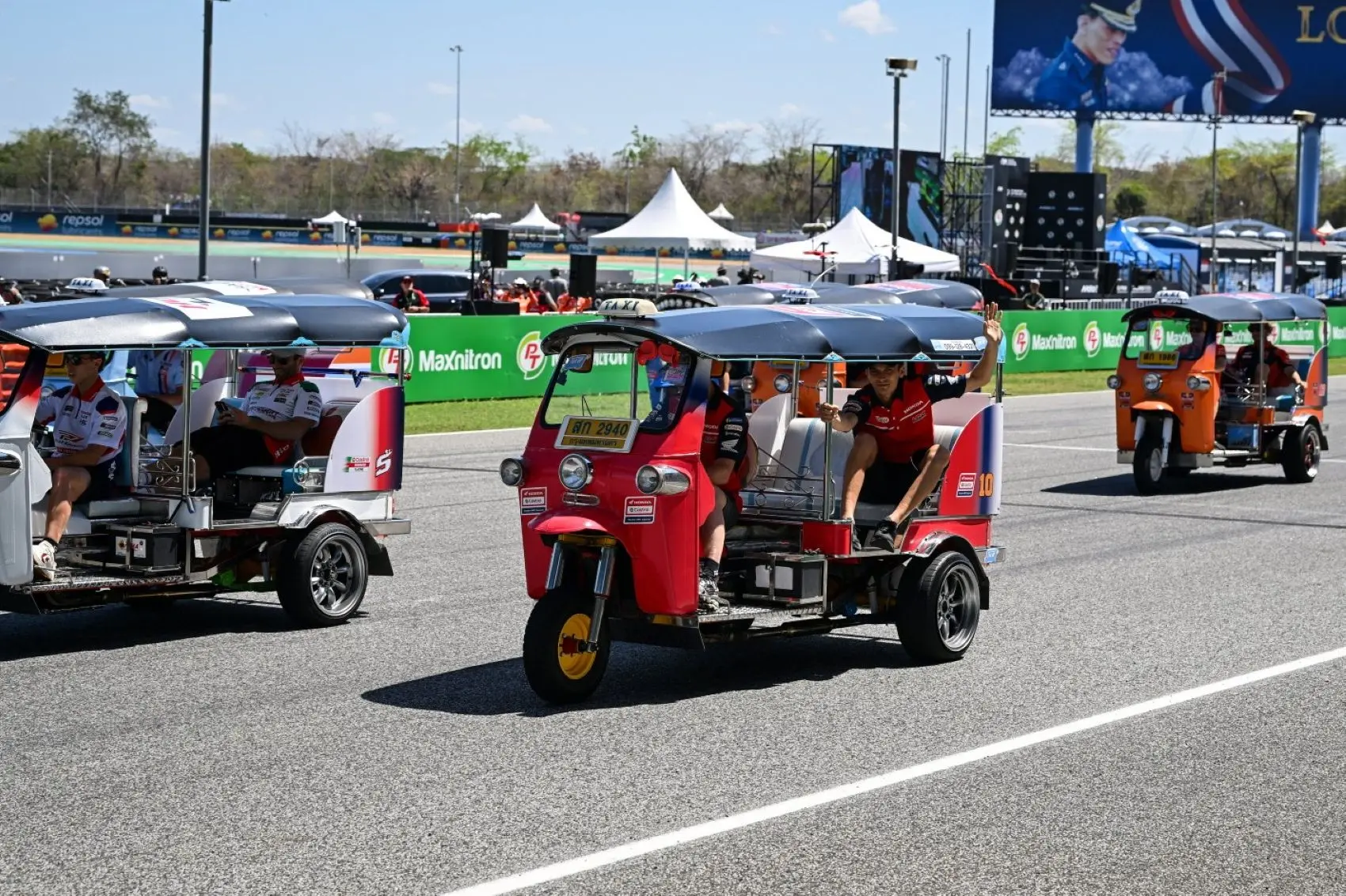 A MotoGP pilótaparádéja általában abból áll, hogy a pilótákat felterelik egy platóra, miközben egy lassú kört tesznek meg a pályán. Eközben pedig egy riporter kérdezi a versenyzőket. A Thai Nagydíjra azonban a szervezők csavartak egyet a szisztémán, és a főszereplők ezúttal tuktukokat vezethettek a Tuk-Tuk kihívás keretein belül.